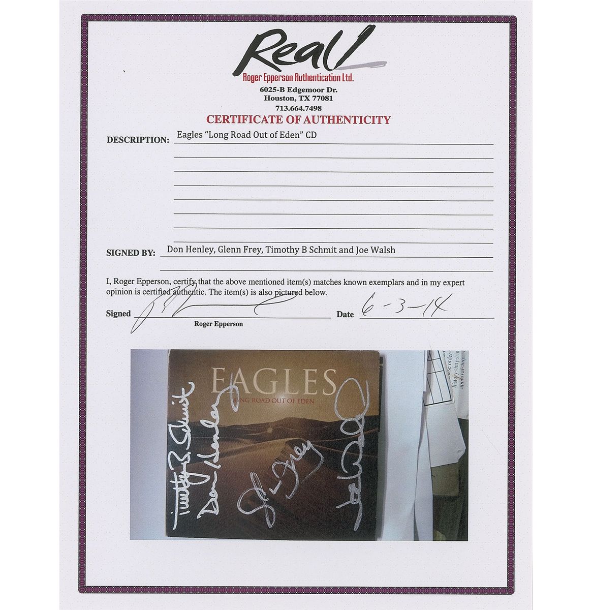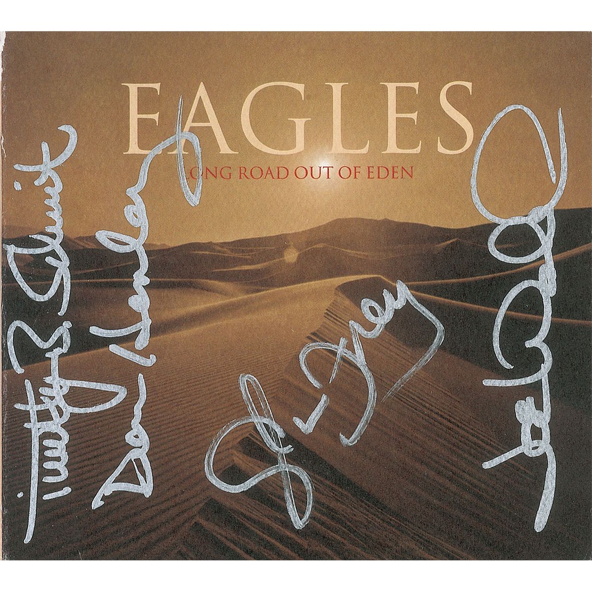 Long Road Out of Eden CD signed on the front cover in silver ink by Don Henley, Glenn Frey, Joe Walsh, and Timothy B. Schmitt. In very fine condition. The CD is included. Accompanied by a full letter of authenticity from Roger Epperson/REAL.