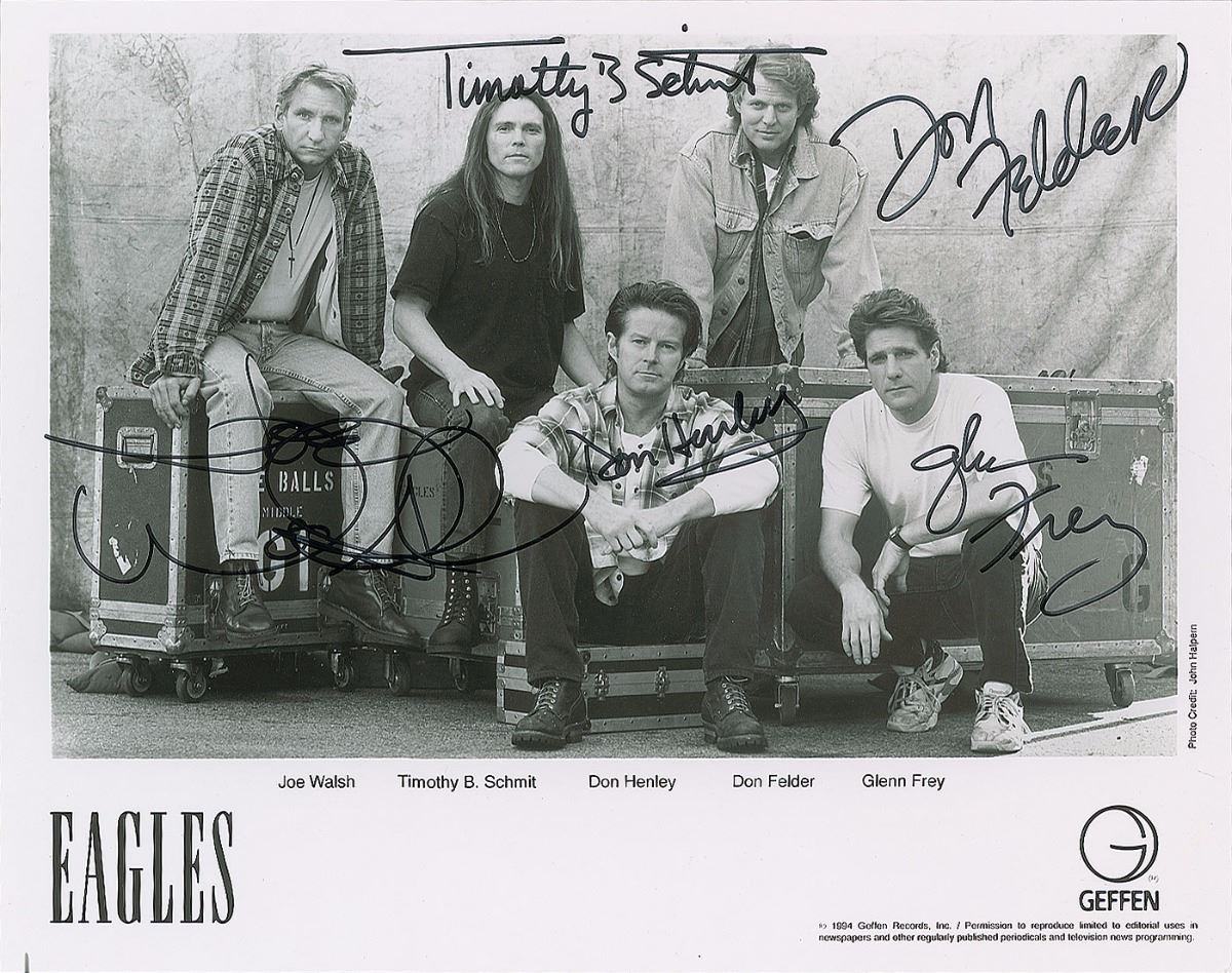 Satin-finish 10 x 8 Geffen Records publicity photo of the Eagles from 1994, signed in black felt tip by Joe Walsh, Timothy B. Schmit, Don Henley, Don Felder, and Glenn Frey. In fine condition. Pre-certified REAL.