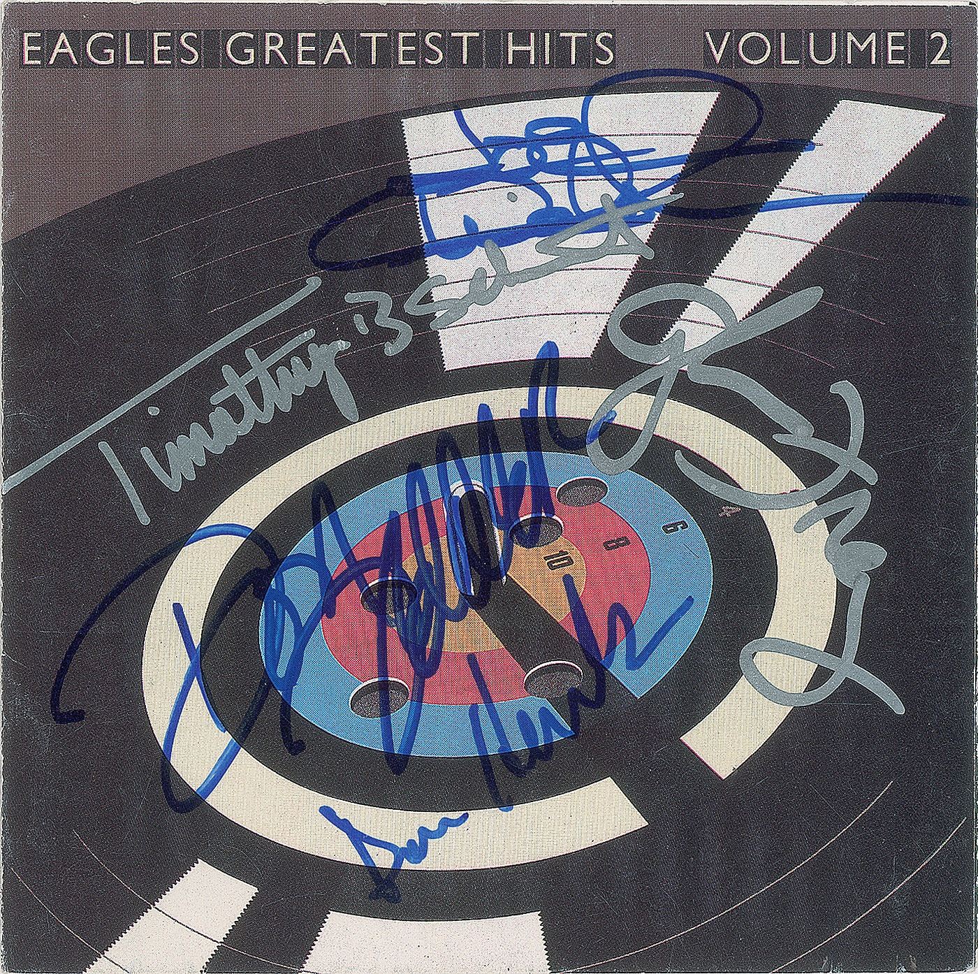 CD booklet for Eagles Greatest Hits Volume 2, signed in silver ink by Glenn Frey and Timothy B. Schmit, and in blue felt tip by Joe Walsh, Don Felder, and Don Henley. In fine condition.
