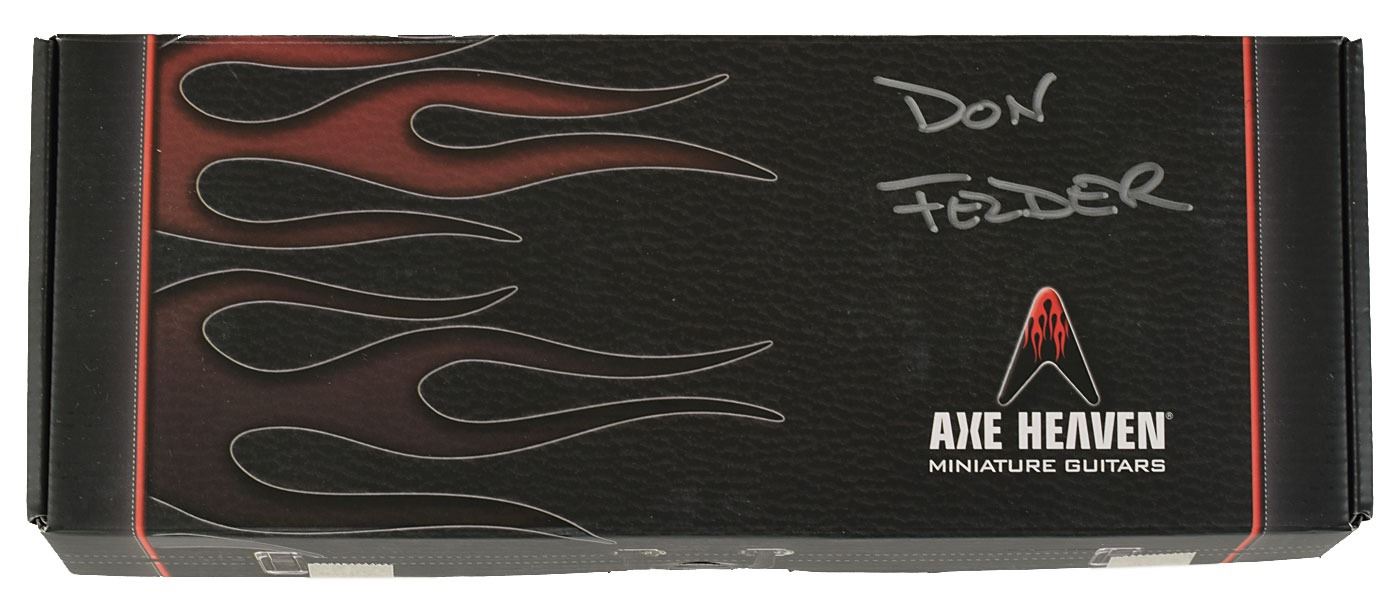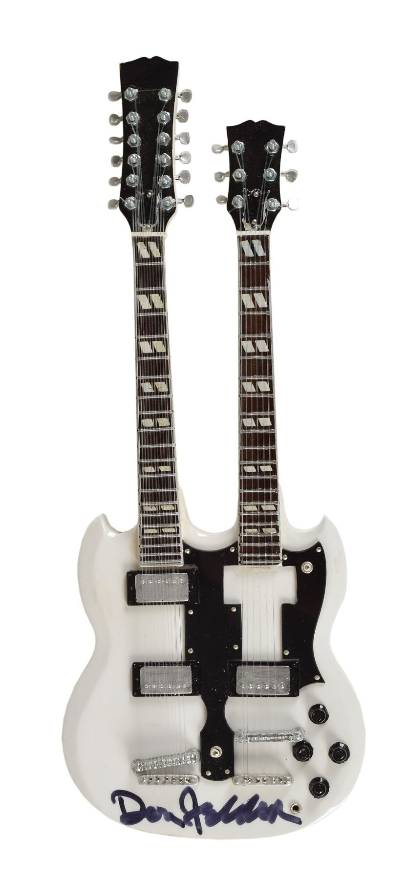 Three items: a 1:4 scale Axe Heaven miniature guitar model of Don Felder's iconic Gibson EDS-1275 Double Neck electric guitar with 12-string upper neck and 6-string lower neck, signed on the body in black felt tip by Felder, who also signs the original Axe Heaven model box in silver ink; a beautiful semi-glossy 12 x 12 cardstock photo of Don Henley for his fifth album, Cass County, signed in silver ink by Henley; and a personal check, 6 x 2.75, filled out and signed by Joe Walsh, payable to Terry Nelson for $ 1500, November 5, 1982, with the memo field reading: "On Acct—Album Project, asst engineer." In overall fine condition, with a few loose parts to the model guitar that could be reaffixed, and a small crease below the Henley signature. Accompanied by a certificate of authenticity from PSA/DNA for the Felder signatures. Terry Nelson served as the assistant engineer on Walsh's sixth studio album, 1983's You Bought It—You Name It.