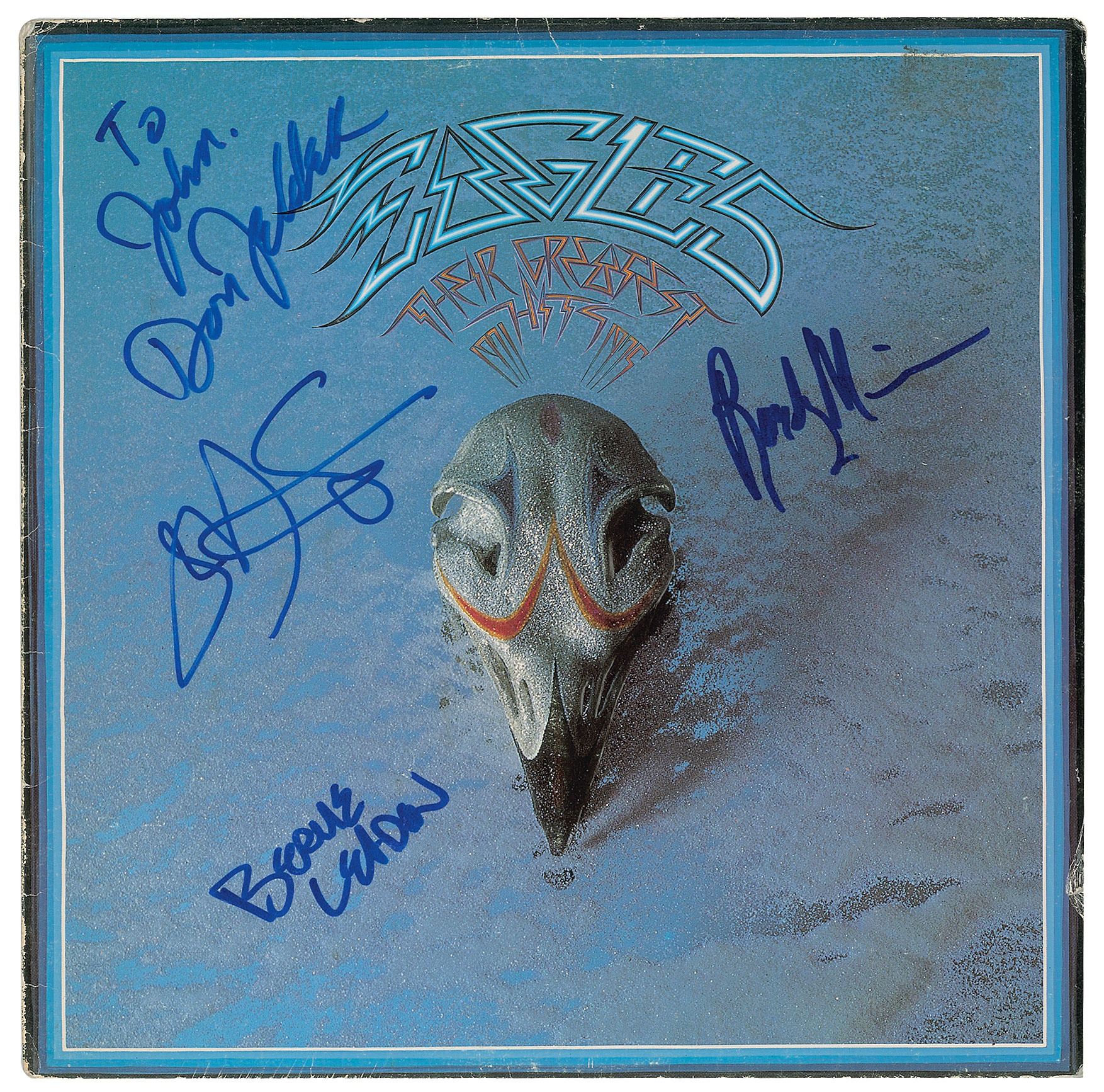 Their Greatest Hits: 1971-1975 album signed and inscribed on the front cover in blue felt tip, "To John, Don Felder," "Bernie Leadon," "Randy Meisner," and "J. D. Souther." In fine condition, with some old price sticker residue. The record is included.