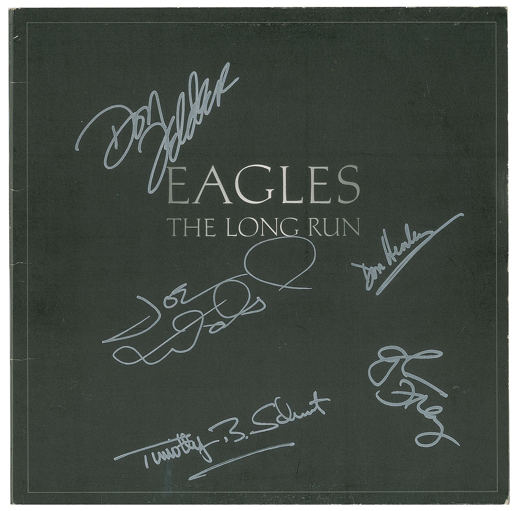 The Long Run album by the Eagles, signed on the front cover in silver ink by Don Henley, Joe Walsh, Timothy B. Schmit, Don Felder, and Glenn Frey. In fine condition. The record is not included. Accompanied by a ticket stub for an Eagles ticket at the Myriad Convention Center in Oklahoma City on February 14, 1980, a laminated "All Areas" access pass for the Eagles' The Long Run Tour in the fall of 1979, and a glossy photo of the band bearing signatures inherent to the original photo.