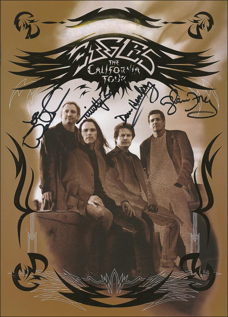 Eagles 2005 The California Tour program, 9.5 x 13, boldly signed on the front cover in black felt tip by Don Henley, Joe Walsh, Timothy B. Schmit, and Glenn Frey. In fine condition. Pre-certified Roger Epperson/REAL and RRAuction COA.