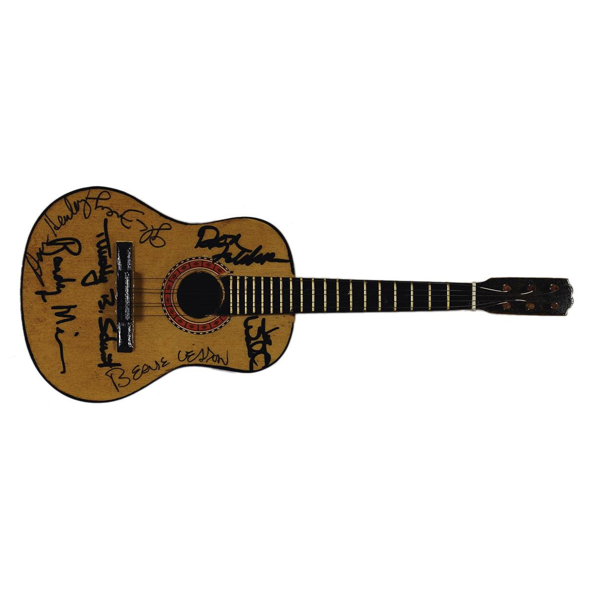 Natural wood finish six-string mini guitar, measuring ten inches in length, signed on the body in black felt tip by Don Henley, Glenn Frey, Randy Meisner, Timothy B. Schmidt, Joe Walsh, Bernie Leadon, and Don Felder. In fine condition. Accompanied by its original carrying case. A handsome display piece signed by all contributors to one of the most successful American bands ever.