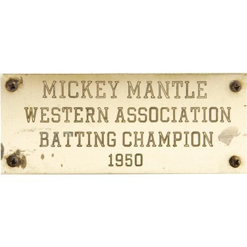 <B>The Earliest Known Mickey Mantle Batting Trophy.</B></I> We have all seen those science fiction movies in which the protagonist goes back in time and changes one seemingly minor thing, only to find that this action derails the proper course of events and sets another in motion, changing everything forever. And so, as we consider this rather modest looking trophy, we wonder what the baseball world would be like if it had never existed. Suppose a nineteen-year old kid from small town Oklahoma named Mickey Mantle had chosen basketball instead, or settled for a life in the mines as his father had. Millions upon millions of young baseball fans would have had to search for a new idol to worship, but nobody could have been quite the same, quite as good. Had this trophy never existed, then neither would have the love and devotion that brought grown men to tears at the mere sight of Mickey decades after he hung up his spikes. And who knows if the Yanks would have earned those twelve pennants and seven World Championship rings? The legend of the Mick, one of the two or three greatest names in the history of our National Pastime, begins here.<BR><BR> Though Mickey Mantle's rookie season was 1951, few fans know that the Mick actually traveled with the Yankees for the final two weeks of the 1950 season, though he didn't play. Mickey's fielding that season had been sub-par to be sure, miscast in the role of shortstop for the Joplin (Missouri) Yankees of the Class C Western Association, where he committed an average of one error every two games at the position. But it was his batting that made the Big League team take notice, as he improved from an impressive .313 average in 1949 to an outstanding .383 in his second, the figure for which he was awarded both this trophy and the opportunity to make the Bronx his home. "I never saw a player with greater promise," Yankee skipper Casey Stengel told the press. "He should lead the league in everything. With his combination of speed and power he should win the triple batting crown every year. In fact, he should do anything he wants to do."<BR><BR> The simple, understated design of the loving cup that was presented to Mickey Mantle in 1950 belies its tremendous value as one of the most historically significant awards in baseball. It stands ten inches tall including its plain wooden base, to which a brass plaque reading "Mickey Mantle, Western Association Batting Champion 1950" is affixed. For years this trophy was on display at Mickey Mantle's famous Holiday Inn of Joplin, Missouri, well known to be one of Mantle's most prized possessions. Tarnishing and minor pitting of the metal of the cup can do nothing to detract from the massive appeal, nor can some incidental nicks and bumps to the wooden base. Rock-solid provenance including notarized affidavits track this exceptional artifact from the hotel to the estate of Mickey's mentor and principal hotel shareholder H.D. Youngman, and finally to the estate of the late Louis McDonald, who purchased the trophy from the Youngman holdings in 2000.<BR><BR> Those who have called this piece "The Holy Grail" of Mickey Mantle collecting are not far off base, as this simple yet monumentally significant cup does inspire a sort of religious awe among devotees of Number Seven. While most collectors have been trained to believe that the game worn jersey is the absolute height of the hobby, we would respectfully argue the case for this trophy instead, as without it those fabulous flannels would have another, lesser name sewn into the collar. All great stories begin at the beginning, as they say. This is the beginning of the story, and the glory, of Mickey Mantle.
