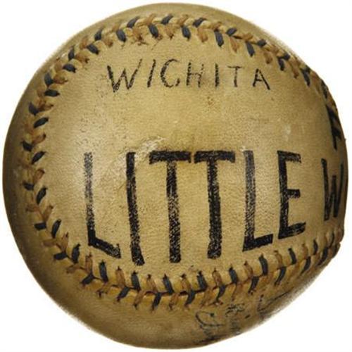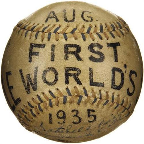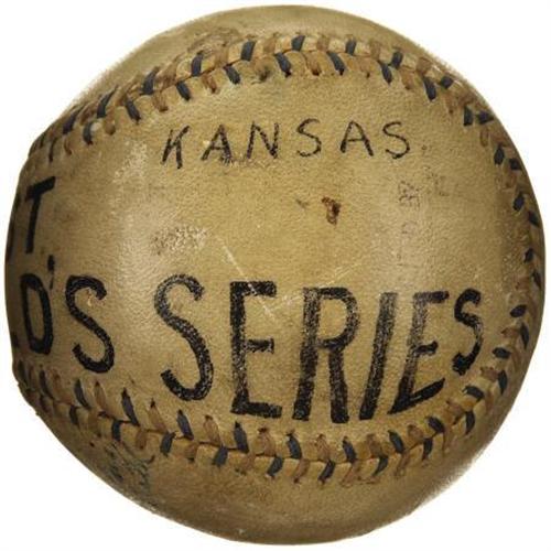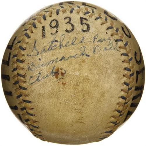 <B>The Earliest Known Satchel Paige Single Signed Baseball, 1935.</B></I> Intriguing and important relic is perhaps the only known surviving piece of memorabilia from the inaugural "Little World Series" of the National Baseball Congress, the brainchild of Wichita sporting goods salesman Hap Dumont to bring top level semi-pro baseball to the Midwest during the Depression. In order to assure the first Series would be a success, Dumont offered the exorbitant sum of $1,000 to Satchel Paige's Bismarck (ND) touring team, an offer gladly accepted by the eventual Champs. Paige would strike out sixty batters and win four games, each mark still standing as a tournament record to this day. The ball is artfully emblazoned with the the words, "First Little World's Series, Aug. 1935, Wichita, Kansas," with Paige signing the southern panel in his early "Satchell" double-L format, adding "Bismarck Ball Club" below. Paige's autograph and inscription survive at an impressive strength of 7/10. The ball exhibits a degree of toning and surface abrasions, but neither issue is of any noteworthy concern. An exceedingly scarce Negro League playing-days single for the advanced autograph collector. <I>LOA from PSA/DNA. LOA from James Spence Authentication.</B></I><BR><BR><b>Shipping:</b> Balls, Pucks, etc., Small (<a target="_blank" href="http://www.heritageauctions.com/common/shipping.php">view shipping information</a>)