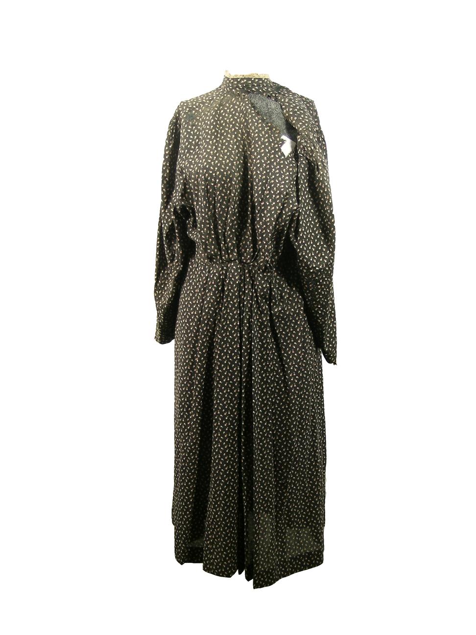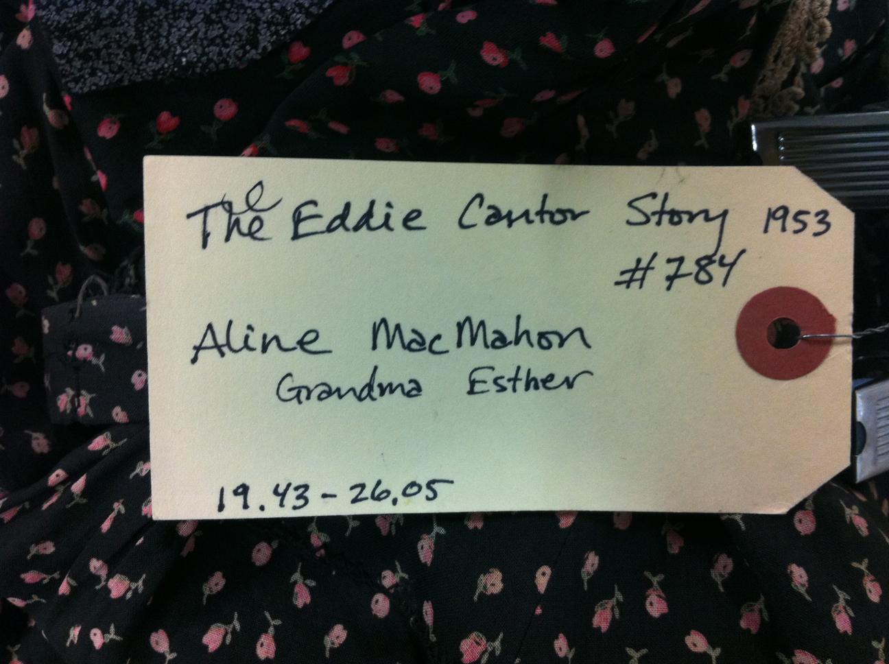 The Eddie Cantor Story (1953) - Grandma Esther (Aline MacMahon) screen worn dress. The dress is green with long sleeves and white floral print. It has snaps in the back and a rip in the front dress. Inside is a modern Warner Brother barcode label and a wardrobe tag with production number information from a costume historian who matched the dress to the film.
