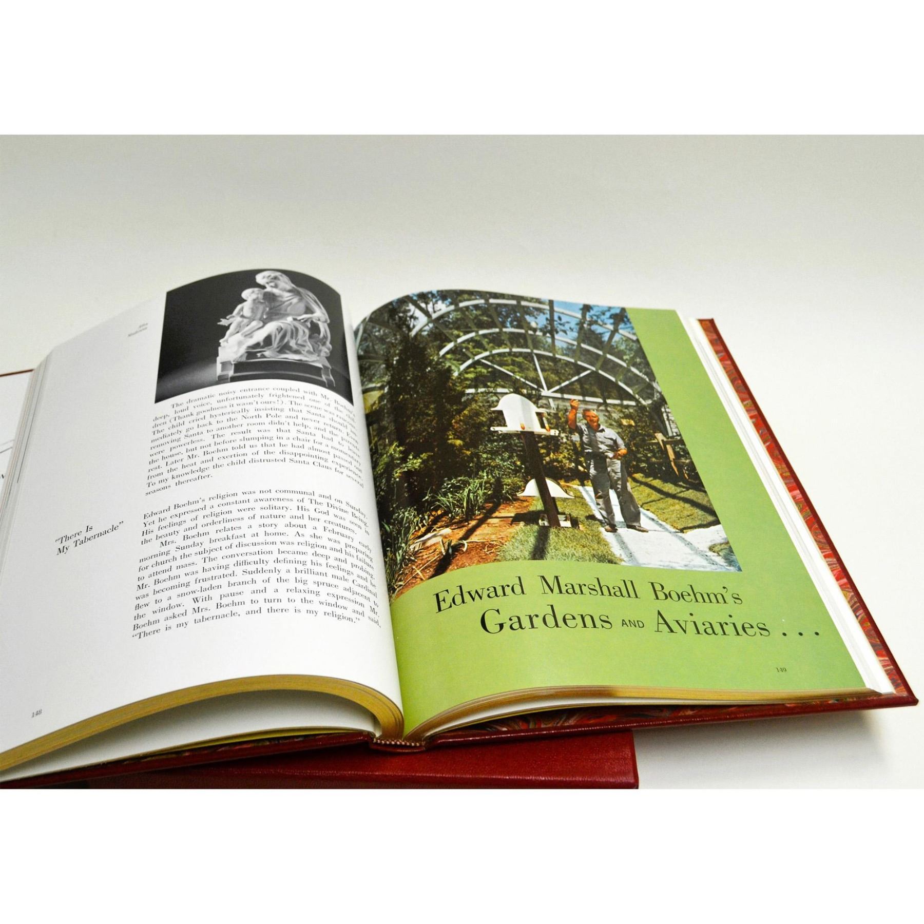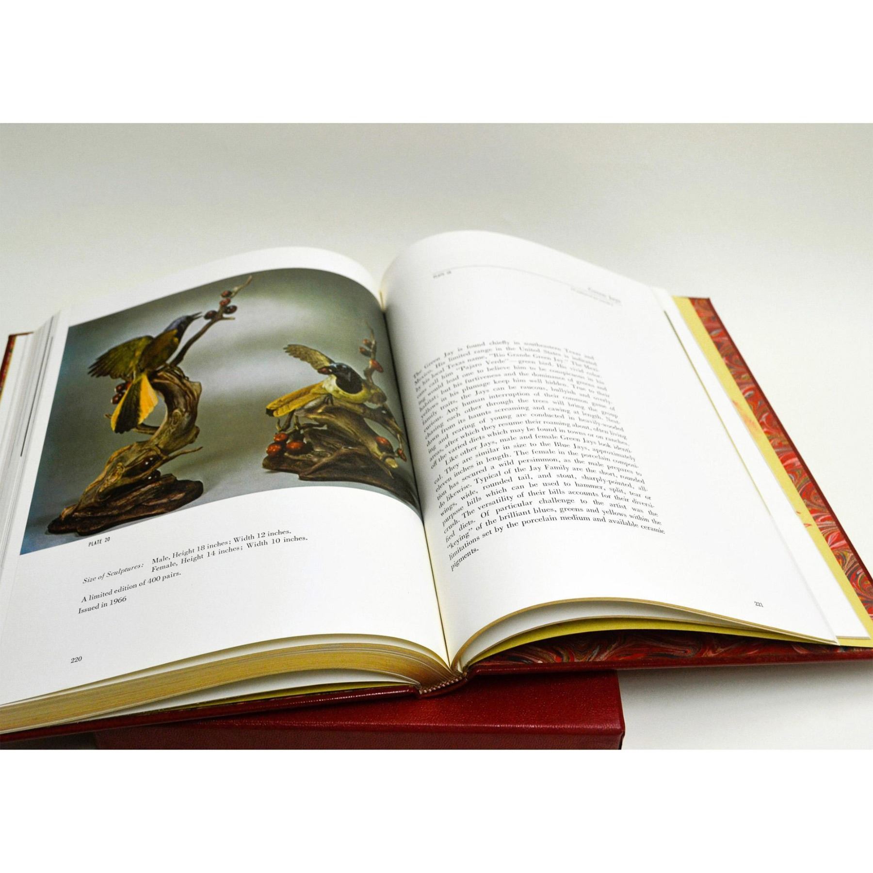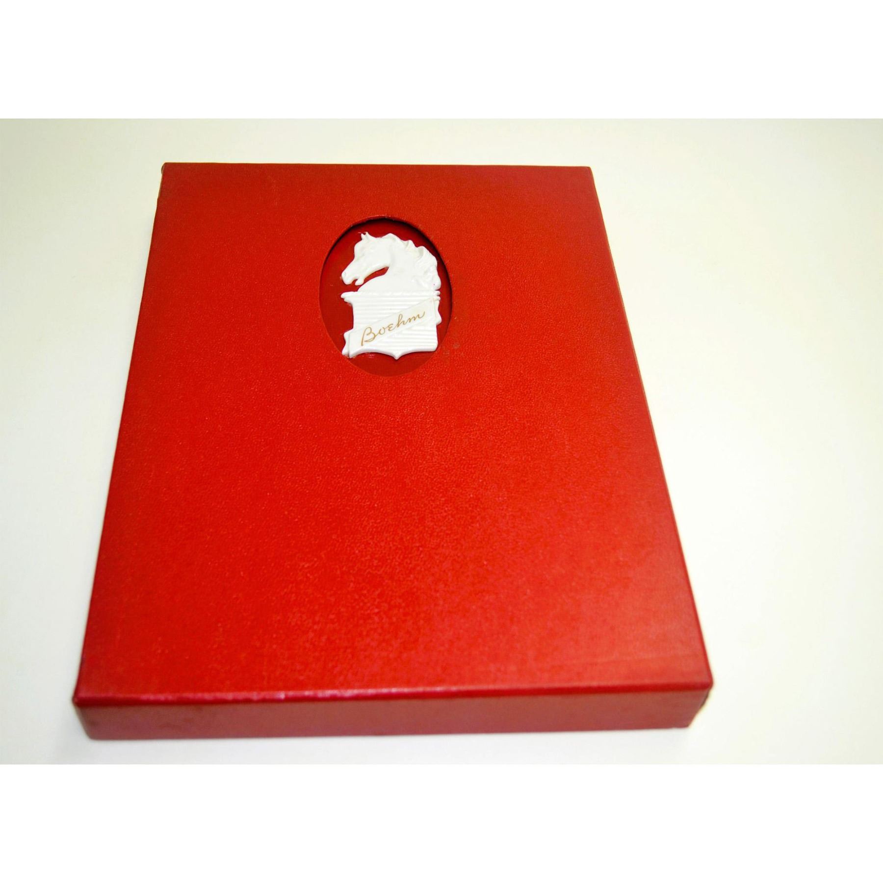 A Hardcover, Red Leather Book, with Gold Stamping, with the Porcelain Bas Relief Boehm Logo Horse Head attached to the Front Cover, accompanied by a Red Matching Hard Cover Sleeve, authored by Frank J. Cosentino, President of the E.M.Boehm, Inc. Studios, this Limited Edition Book By Frank Cosentino brings special insight into the Porcelain Studio as a personal friend and business aide of Ed Boehm. A 264 Page Reference, Book that takes you through the journey of Edward Marshall Boehm and Mrs. Helen Boehm. Beautiful color illustrations featuring many of the early and rare Boehm Porcelain Sculptures and their stories of life surrounded by the Boehm Studios. A Limited Edition of only 3500 copies. Signed in Red script by Helen F. Boehm. Library of Congress Card Number 75-130889. Size: 9" W x 12.5"H. Hard Sleeve Cover included. Excellent Condition. From the Archival Collection of Re Vann Galleries, G.Reasoner, Owner.