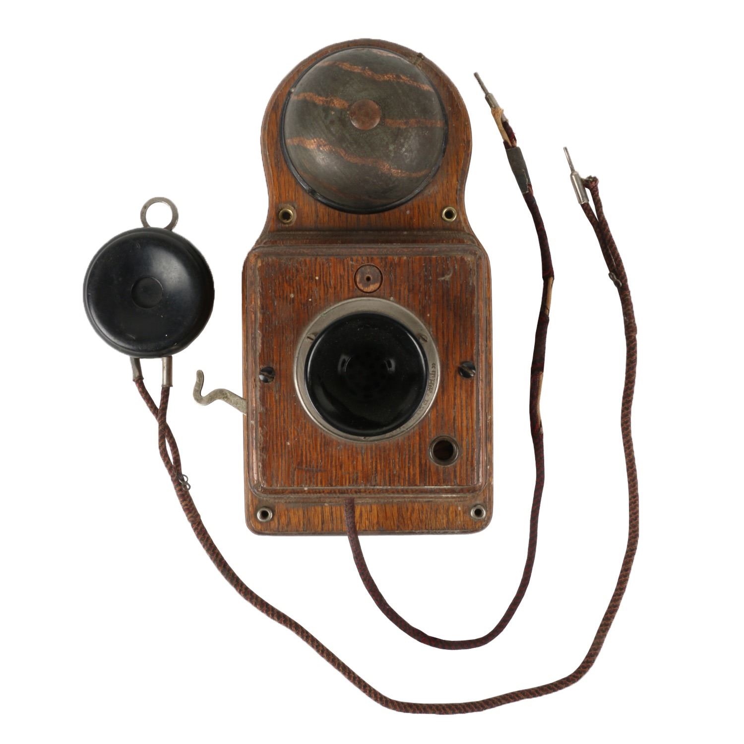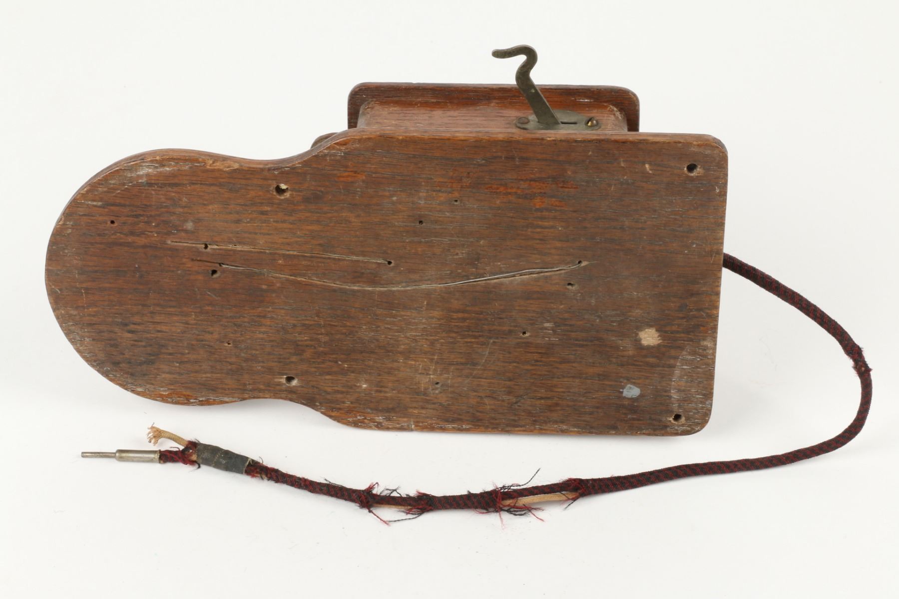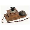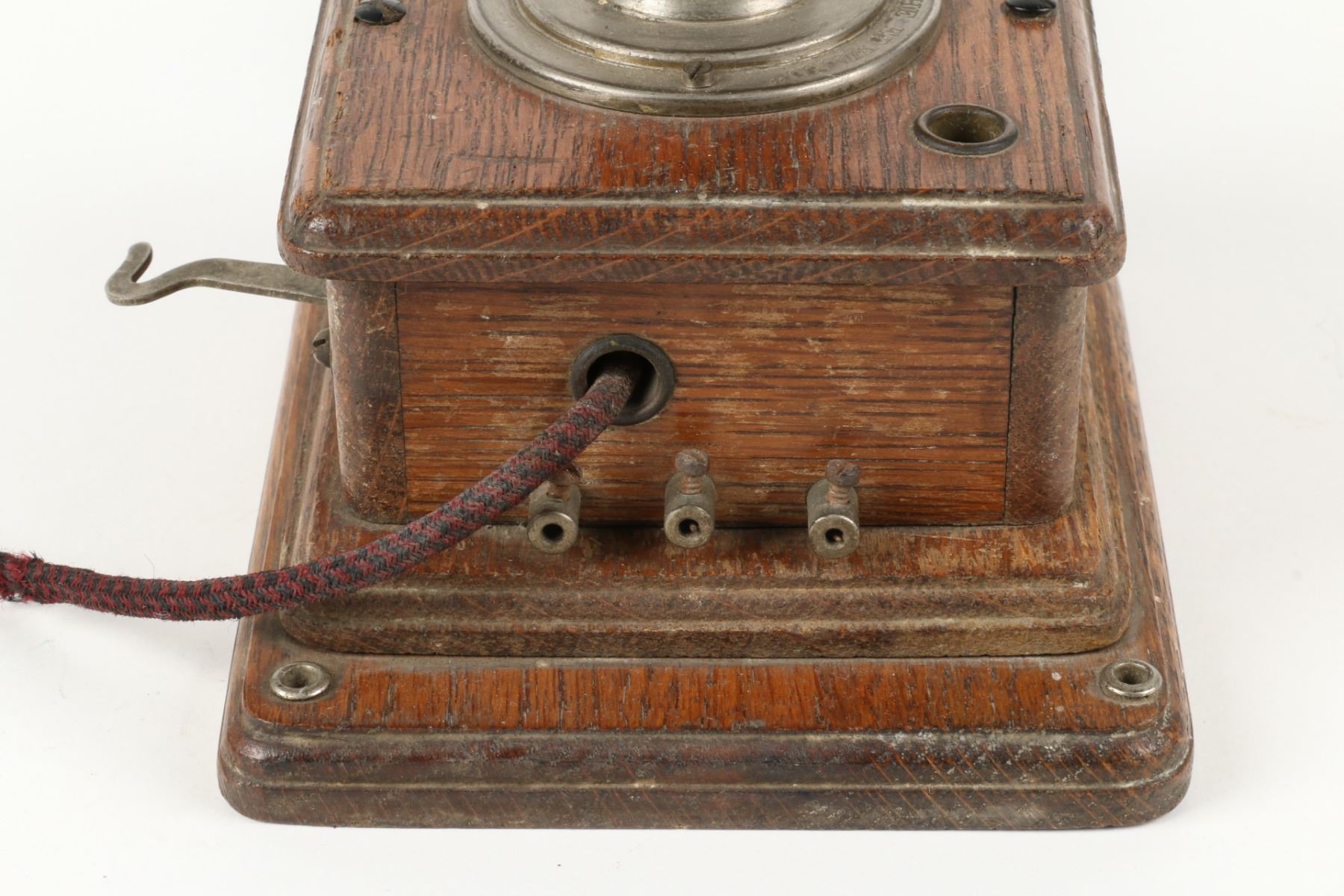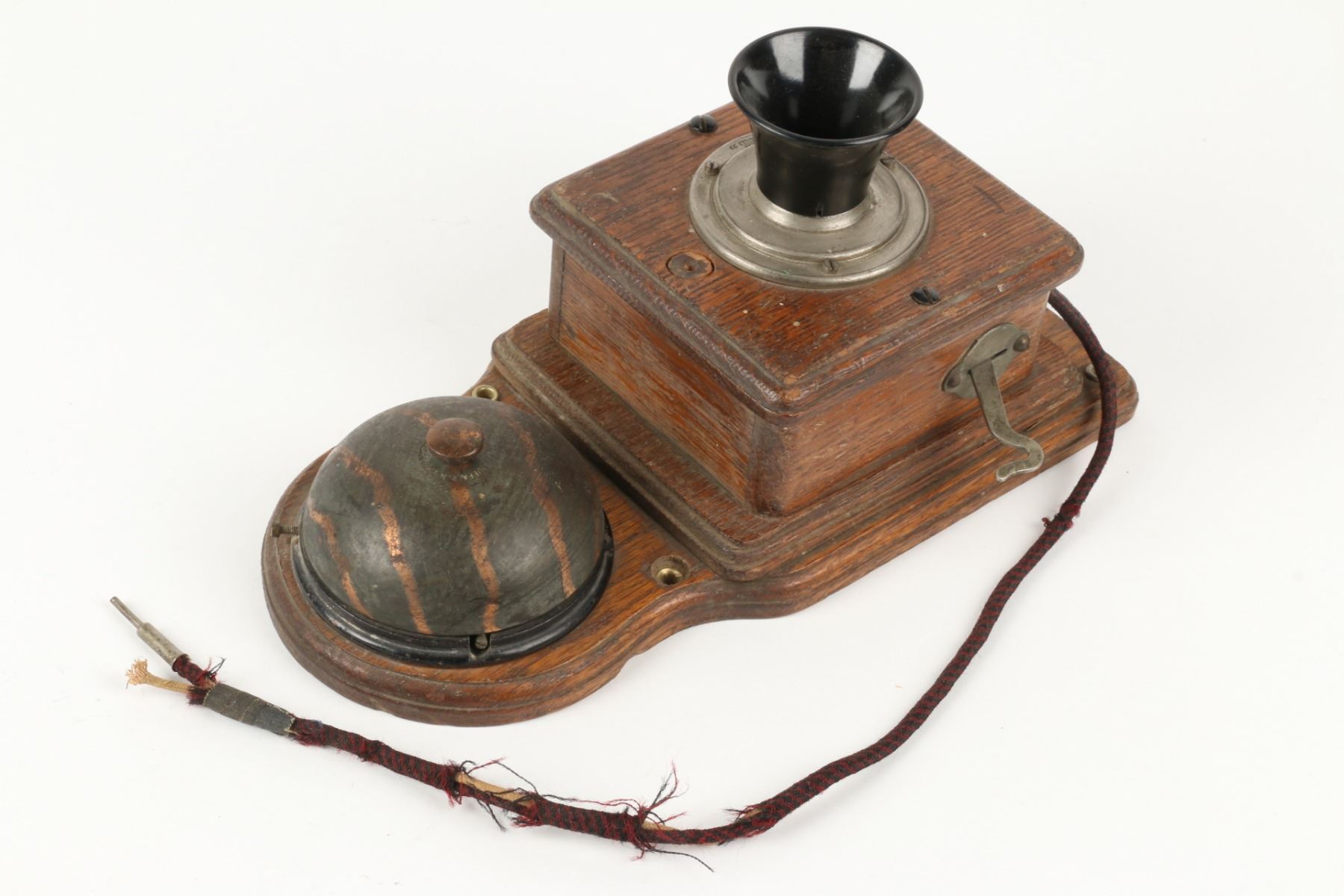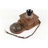 American. Circa 1915. Oak wall unit. Bronzed bell. 9.5" x 4.5" x 4". Replica, mis-fitting mouthpiece. $100-200.