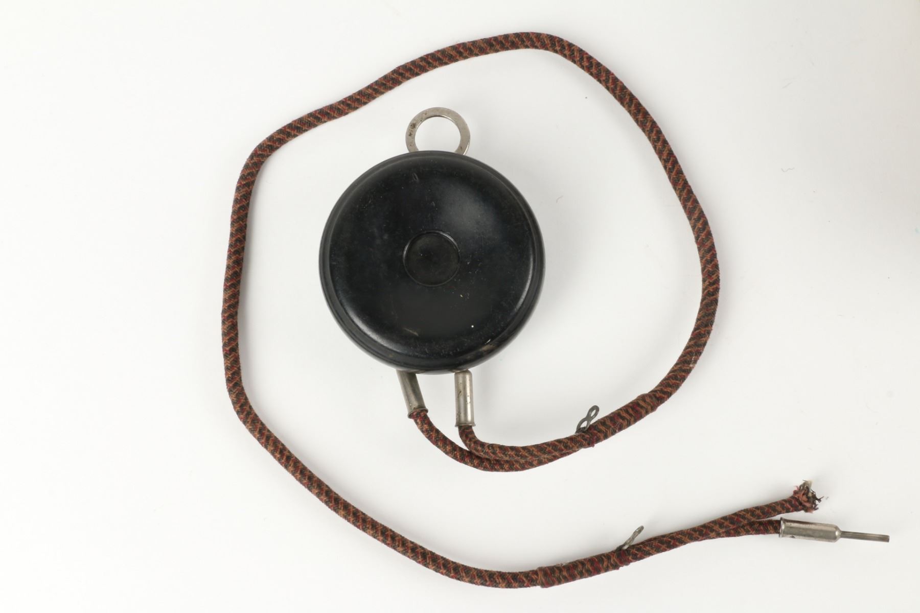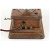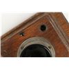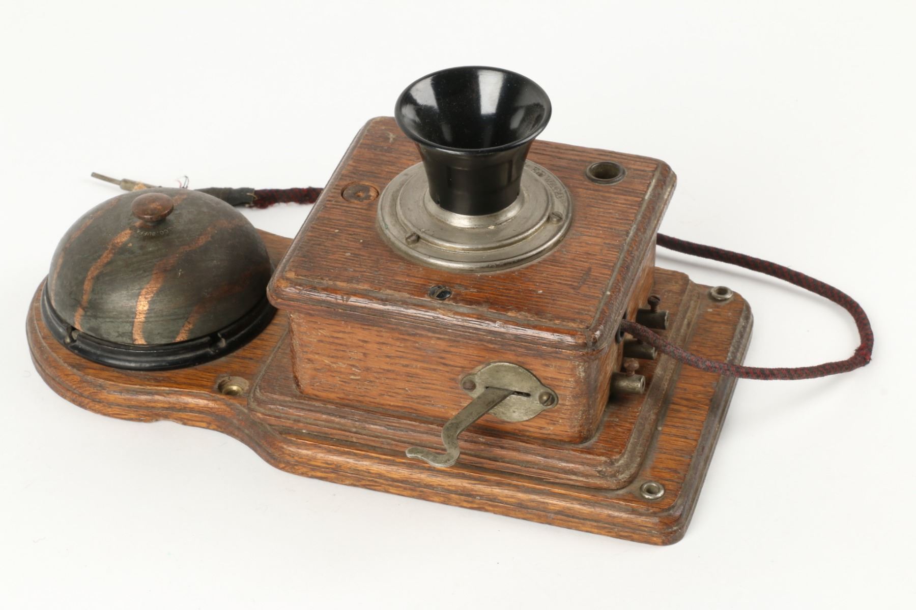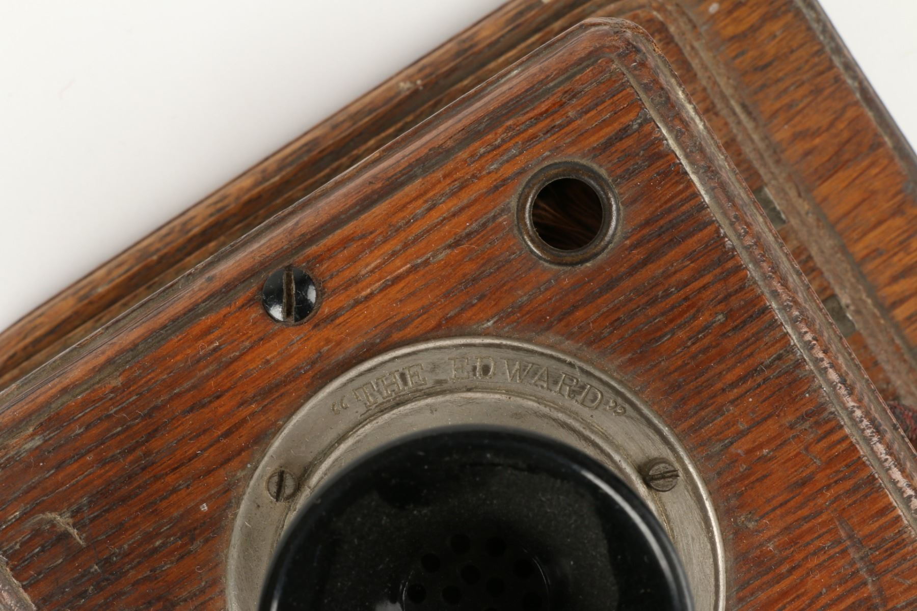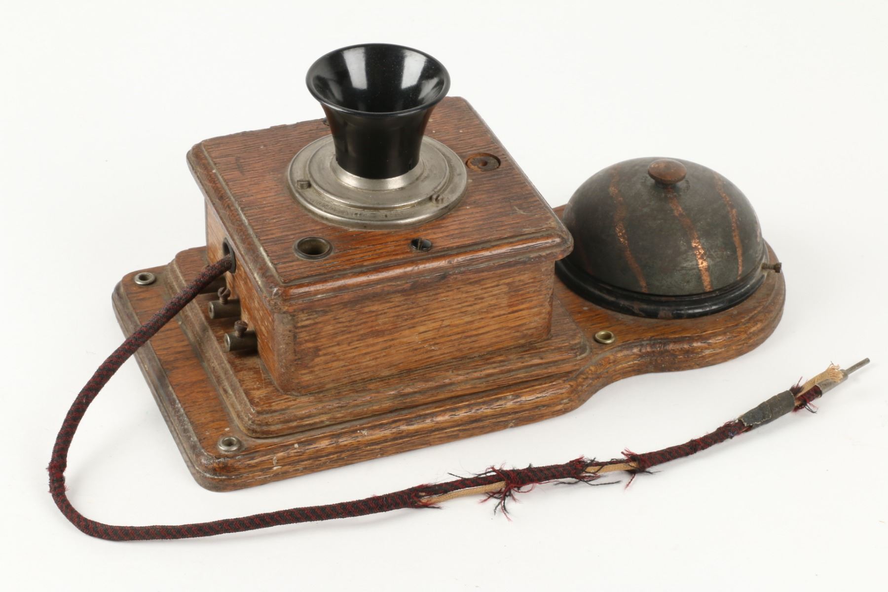 American. Circa 1915. Oak wall unit. Bronzed bell. 9.5" x 4.5" x 4". Replica, mis-fitting mouthpiece. $100-200.