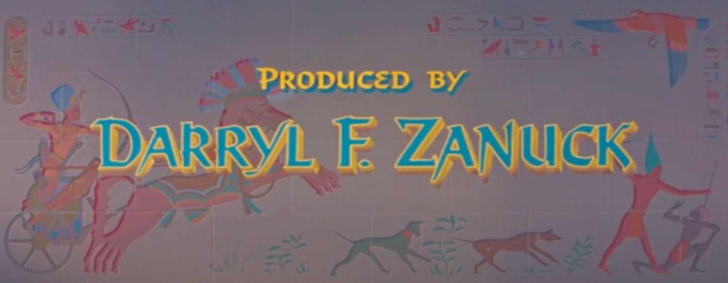 (TCF, 1954) An original opening title sequence background painting from the CinemaScope period epic, The Egyptian. Accomplished in gouache on board, the painting is designed to appear as if painted on a brick wall, and depicts a charioteer and combat scene with hieroglyphic captions in the style of Ancient Egyptian art. This background appears in two shots of the opening title sequence, one with Darryl Zanuck's producer credit and the other with Michael Curtiz's director's credit. Measuring 23.25"x46.25" within a 27.25"x49.75" frame, the artwork is in good condition with some water staining at left and in the lower quarter of the piece, as well as scattered scratches and scuffs.
