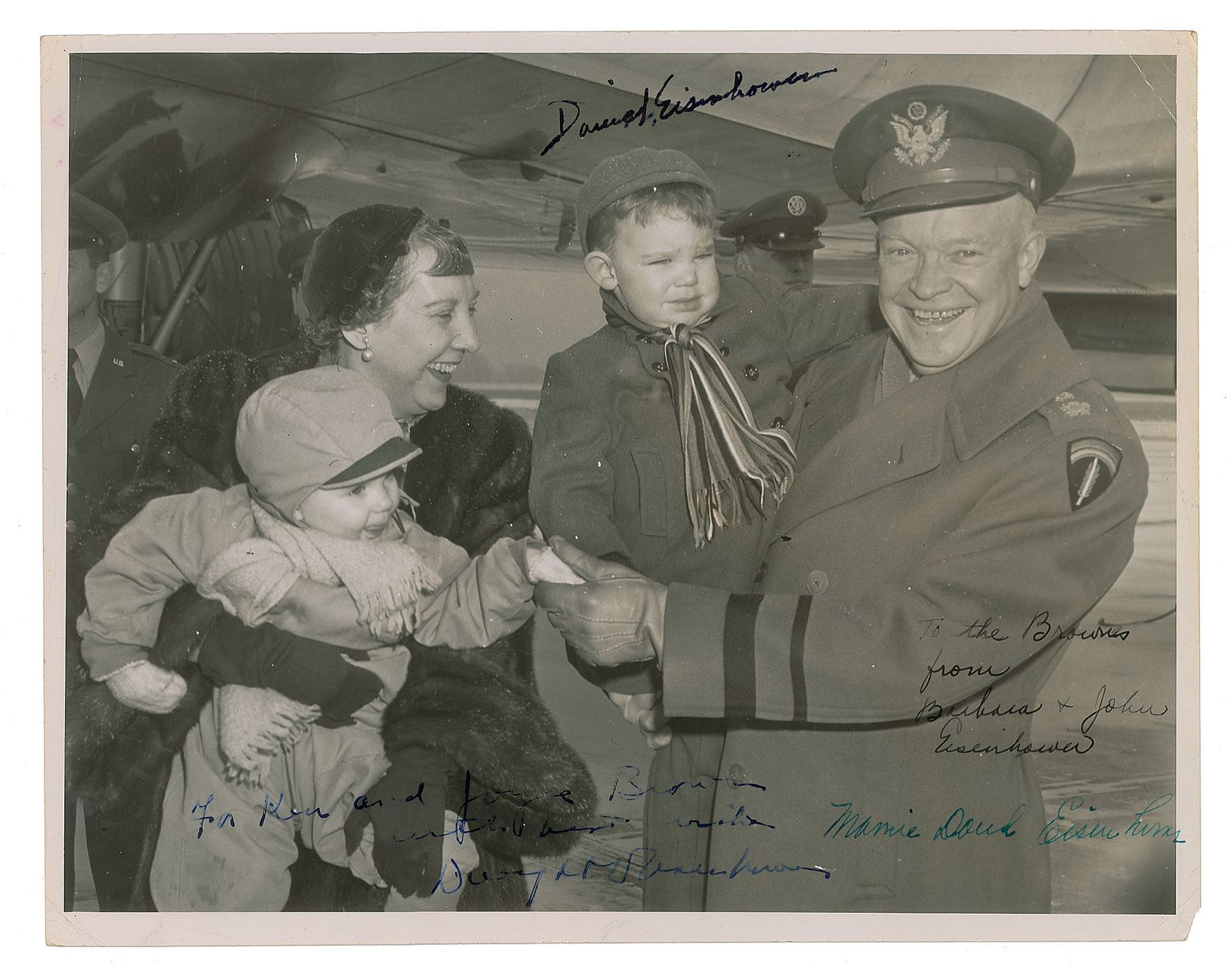 Vintage glossy 10 x 8 photo of Dwight and Mamie Eisenhower standing below the wing of a plane and being greeted by their grandchildren, signed and inscribed in various ink types by three generations of Eisenhowers: "For Ken and Joyce Brown, with best wishes, Dwight D. Eisenhower," "Mamie Doud Eisenhower," "To the Browns from Barbara Eisenhower" and "& John," and "David Eisenhower." Reverse of photo bears a New York Herald Tribune stamp, as well as typed captions indicating that Dwight and Mamie signed in June 1952, Barbara and John in 1951, and David in October 1986. In very good to fine condition, with creasing to the edges, and a missing lower right corner tip.