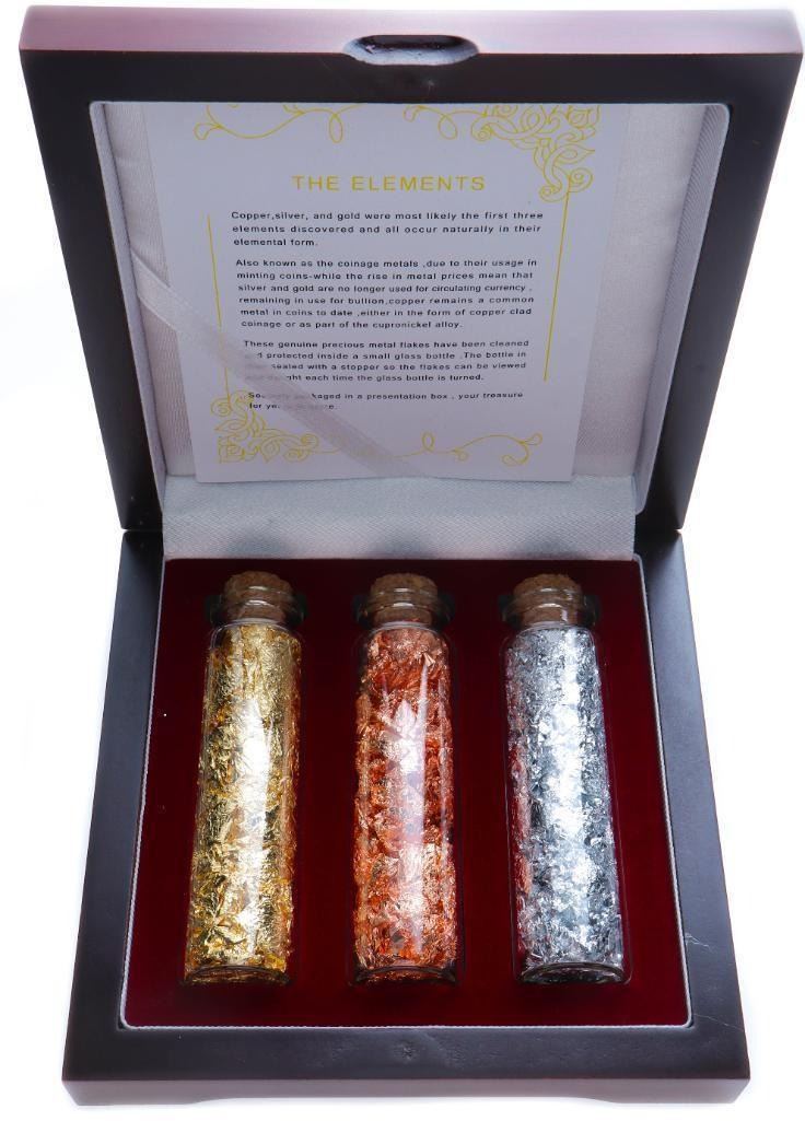 The Elements Collection- 3 x Assayers Glass Jars - .9999 24KT Gold Flakes, .9999 Fine Silver Flakes, .999 Fine Copper Flakes. Deluxe Wood case & Certificate