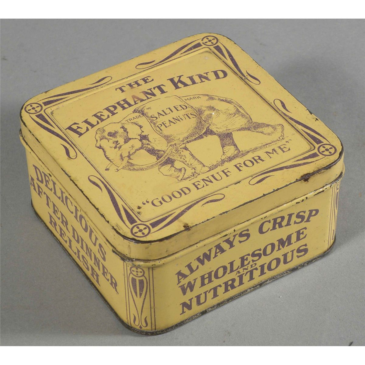 The Elephant Kind Salted Peanut Tin. Some minor edge ware otherwise very good condition. 4 X 2 X 4 inches. Start Price $100