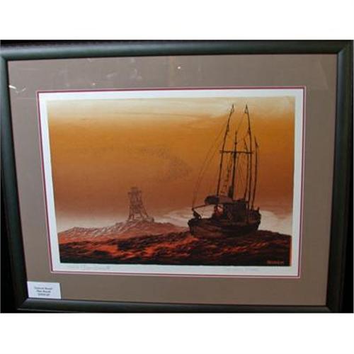 Elton Bennett (1910-1974) grew up on the Washington coast, where mill work, fishing and dredging are common occupations. He spent many years working along the shore. Until his marriage in 1946, Bennett was discouraged from pursuing his love of art. He had very little formal training?a year at Washington State when he was 17 and two years after World War II on the G.I. bill at the Portland Art Museum School. Working several jobs, he finally saved enough money to pursue his dream in 1956. Elton Bennett chose silkscreen printing for his medium. He would always use a great number of screens and colors in infinite combinations so that each finished serigraph was a unique work of art. Bennett?s serigraphs depict the Pacific Northwest coastal environment and give glimpses of the working lives of the people the artist knew and worked with all his life.