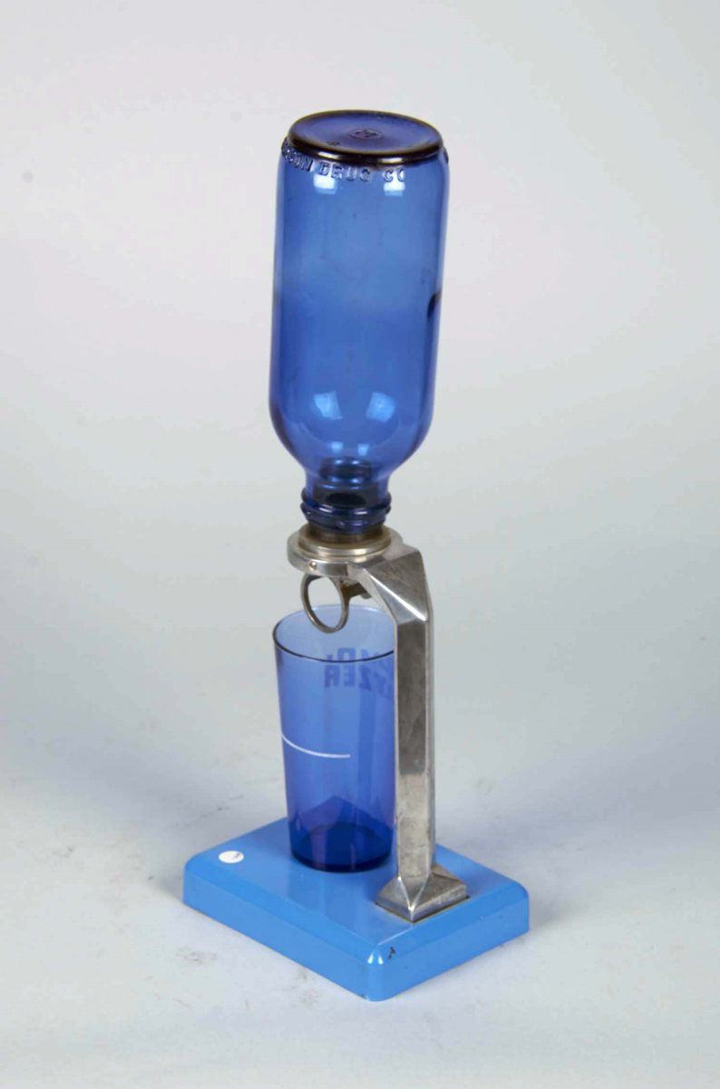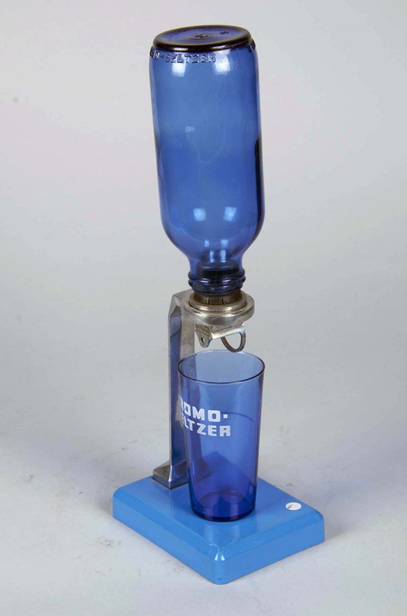 Includes blue glass Bromo-Seltzer bottle and cup, blue porcelain base. Dispenser is missing turning handle. Condition (Very good). Size w/out bottle 9.5" x 4.5" x 5.75"