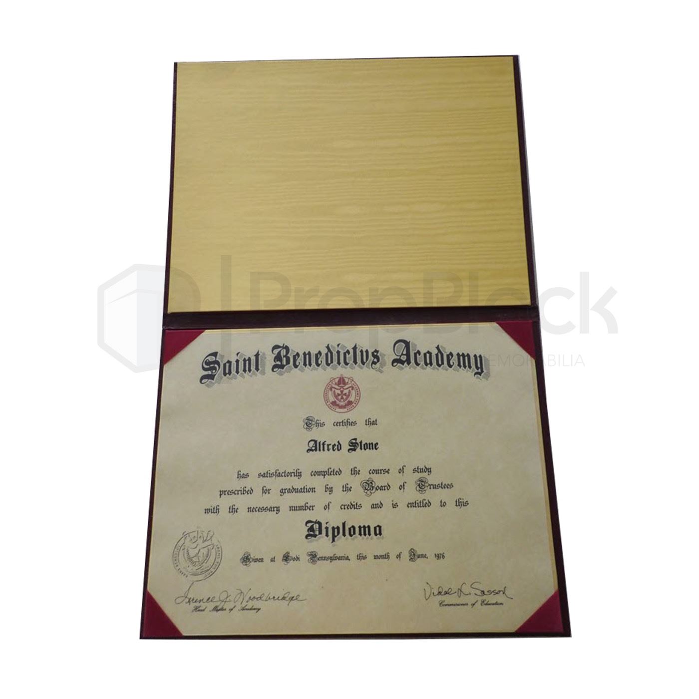 Original diploma used in the production of the 2002 film The Emperor's Club. Kevin Kline stars as Arthur Hundert, a dedicated and inspiring classics professor who has devoted his life to teaching at a prep school for boys. New student Sedgewick Bell, the headstrong son of a powerful senator, joins his class and inexorably alters Mr. Hundert's life. It is a clash of wills and personalities as these two people seemingly battle for the hearts and souls of the other students at St. Benedictus. This piece features a thick plastic vinyl leatherette diploma case that is red in color with the "St. Benedictus" logo on the cover. The diploma is printed in full color with black lettering and embosses. This item remains in excellent, production used condition.