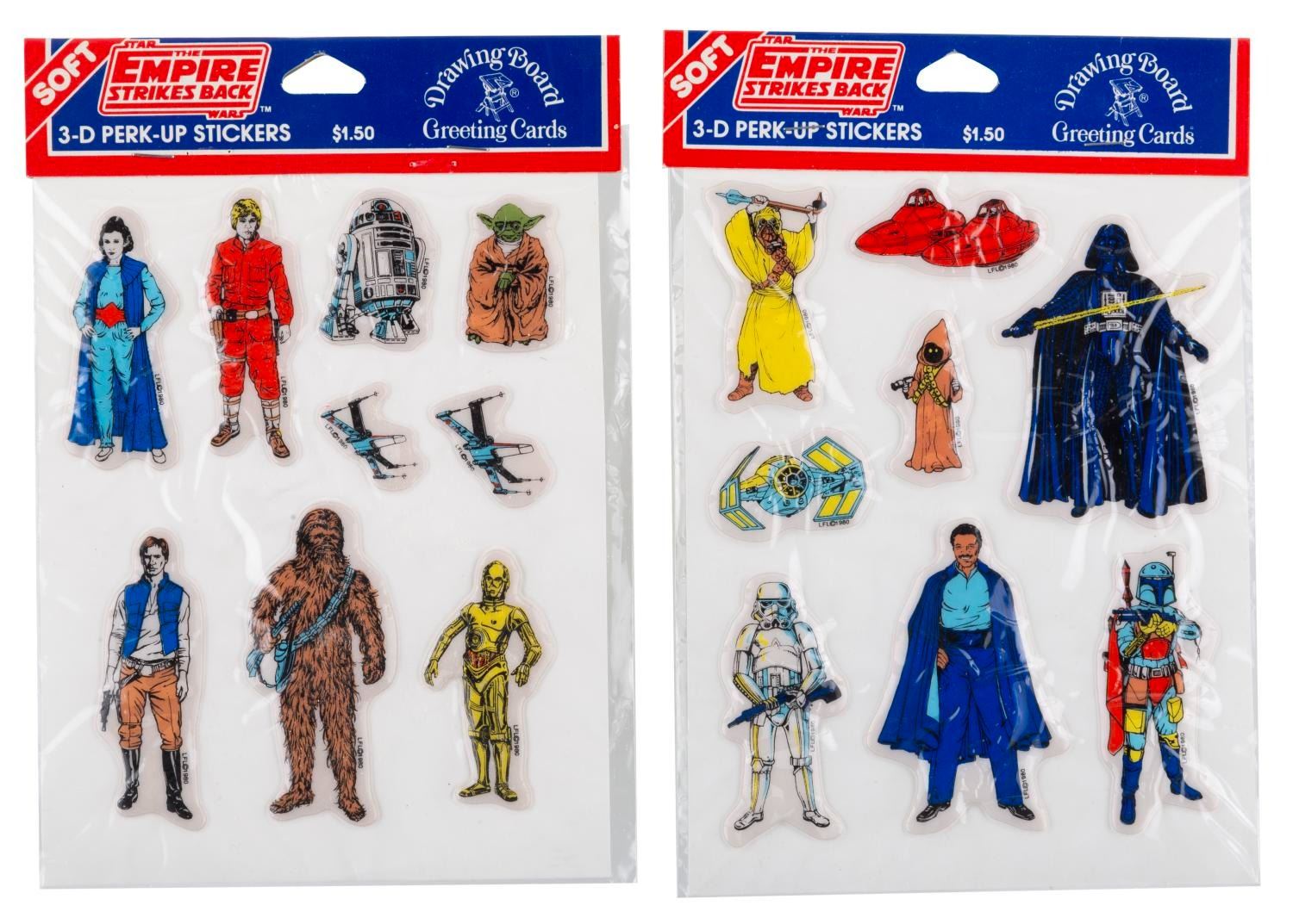 (Drawing Board Greeting Cards, 1982) Two sets of puffy “3-D Perk-up stickers” of characters and ships from “The Empire Strikes Back.” Each measuring 7.5” x 5” overall, the stickers are in fine condition, sealed on original cards.