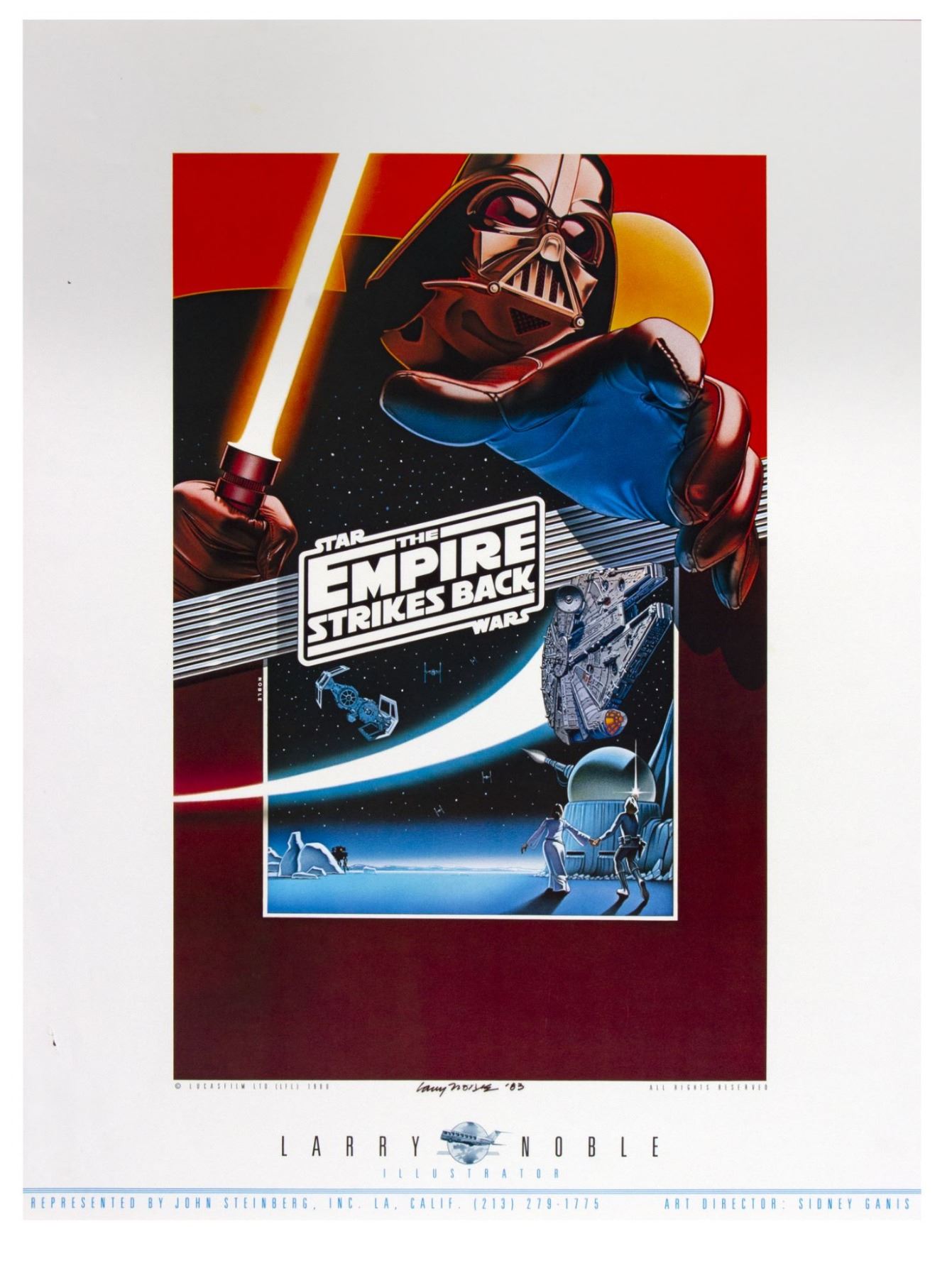 (LucasFilm, c.1980/83) A beautiful poster print featuring artist Larry Noble's submission for the theatrical poster for "The Empire Strikes Back". Noble's submission would eventually be selected for a one-sheet poster celebrating the 10-year anniversary of "The Empire Strikes Back" in 1990. This print beautifully captures Noble's unique poster design and is signed by Noble along the bottom edge with a signature date of 1983 while the artwork itself was designed in 1980. Measuring 22.25"x17", the print is in good condition with some minor wear throughout and a small puncture mark in the bottom-left area.