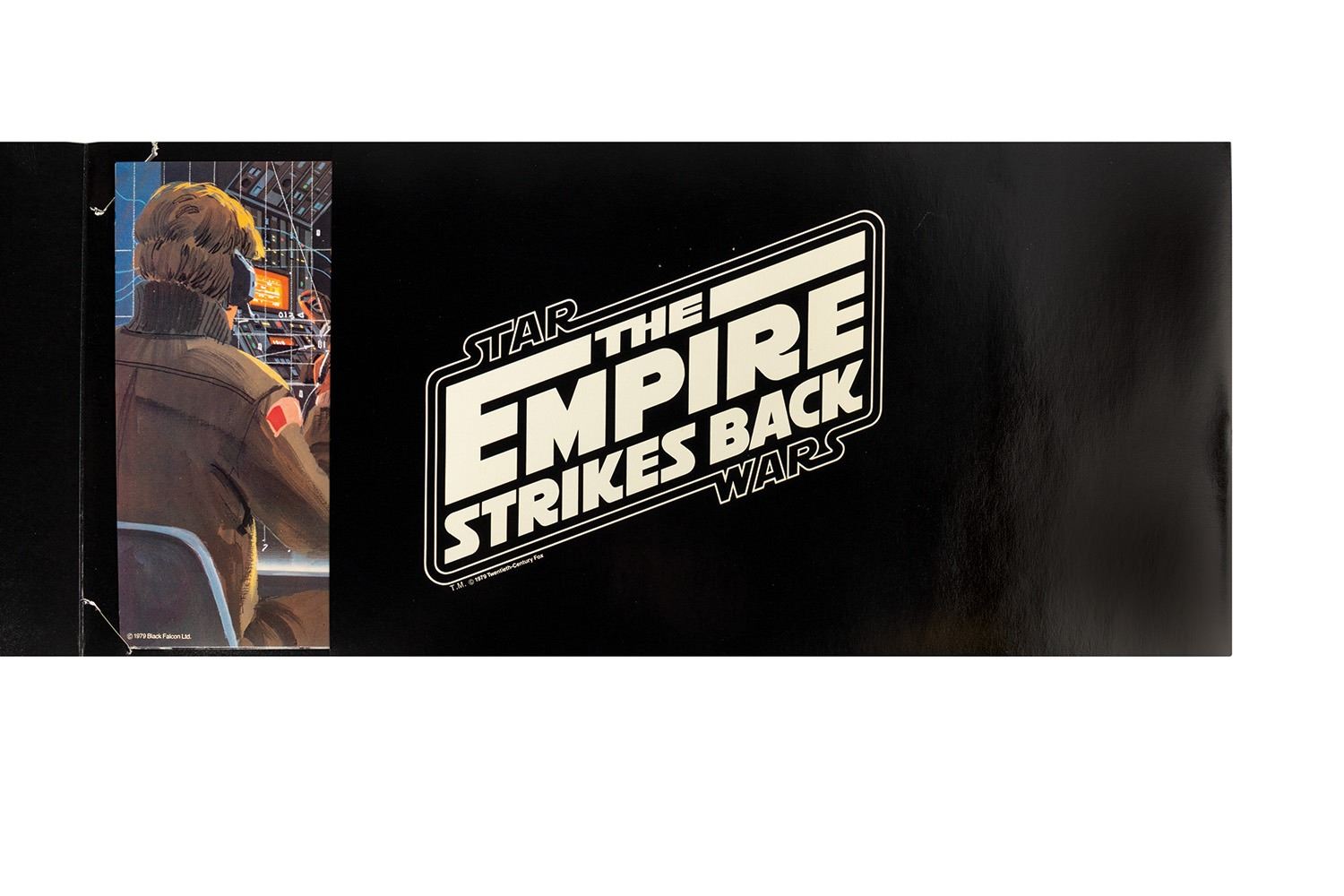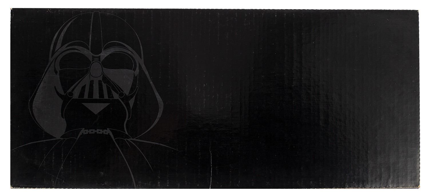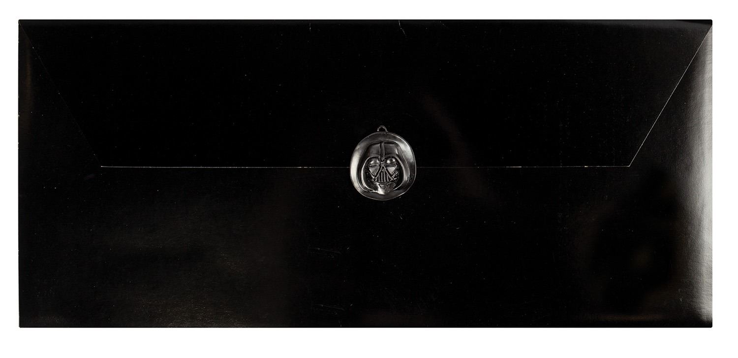 (Lucasfilm, 1979) A rare promotional portfolio for The Empire Strikes Back. The portfolio includes a 4-ounce Darth Vader lead medallion on the cover and contains a pair of Ralph McQuarrie concept art prints. The outer box measures 10.75"x23.5" and 0.75" deep. The prints are in good condition with minor edge wear, and the inner fold-out is in fair condition with some small tears and wear from use.