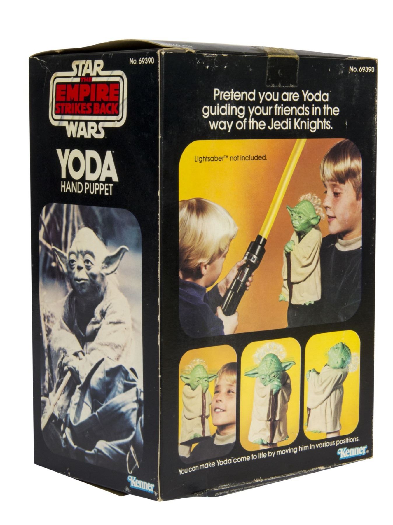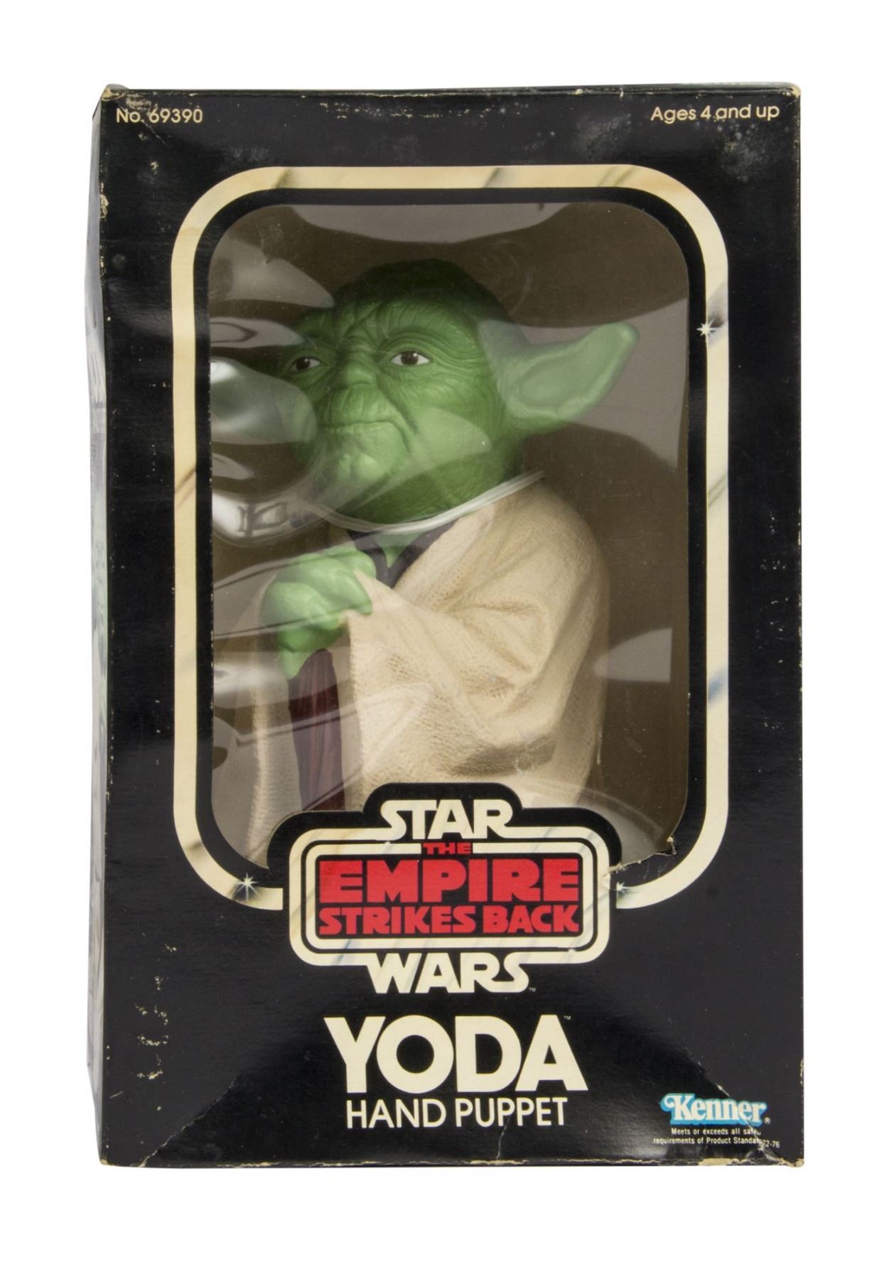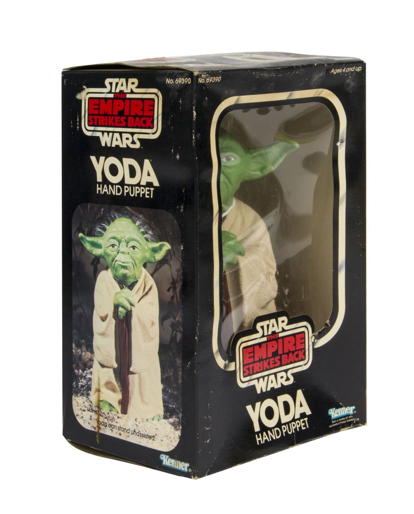 (Kenner, 1980) A very rare Yoda hand puppet from "The Empire Strikes Back". This detailed puppet was created by Kenner and is unused in its original box. The box measures 10" tall and the condition of the puppet is very fine, with some wear to the box including a few small tears and spots of discoloration from storage and age.