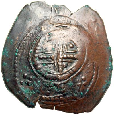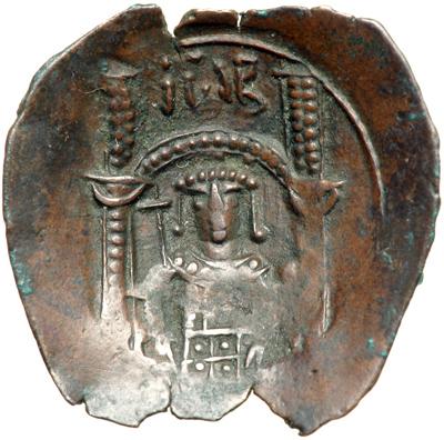 The Empire of Thessalonica. John Comnenus-Ducas, 1237-1242. billion trachy (1.57g), Thessalonica. Cross with pellet in each angle within crescent-shaped ornament (?). Rev. Half-length figure of John stg. facing beneath arch flanked by towers. DOC 36; Sear-Bendall 2221. Nearly Extremely Fine and very rare with light brown patina.