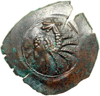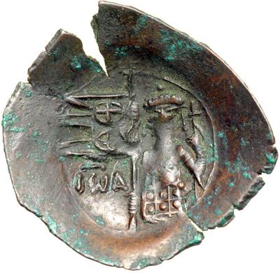 The Empire of Thessalonica. John Comnenus-Ducas, 1237-1242. billion trachy (1.71g), Thessalonica. Outstretched wing. Rev. Half-length figure of John stg. facing, holding large banner with two crosses within circles. DOC 31; Sear-Bendall 2217. Extremely Fine for the type with brown patina, very rare thus.