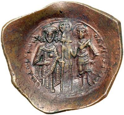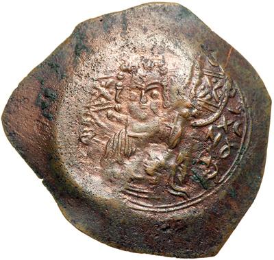 The Empire of Thessalonica. Theodore Comnenus-Ducas, 1224-1230. billion trachy (3.36g), Thessalonica. Nimbate bust of Christ Emmanuel, holding scroll. Rev. Theodore, on l., and St. Demetrius, holding sword over shoulder, on r., both stg. facing, holding between them long staff surmounted by cross within circle. DOC 4; Sear-Bendall 2161. Very Fine or better and rare, has been cleaned.