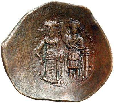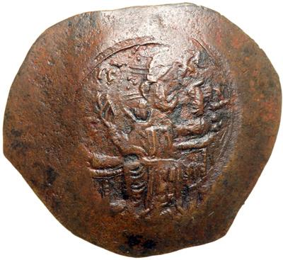 The Empire of Thessalonica. Theodore Comnenus-Ducas, 1224-1230. billion trachy (3.78g), Thessalonica. Beardless Christ enthroned facing, r. hand raised in benediction, l. hand raised and holding scroll. Rev. Theodore, on l., holding cruciform scepter and akakia, crowned by St. Demetrius, on r., holding sheathed sword. DOC 5; Sear-Bendall 2162. Very Fine/good very fine with brown patina, rare.