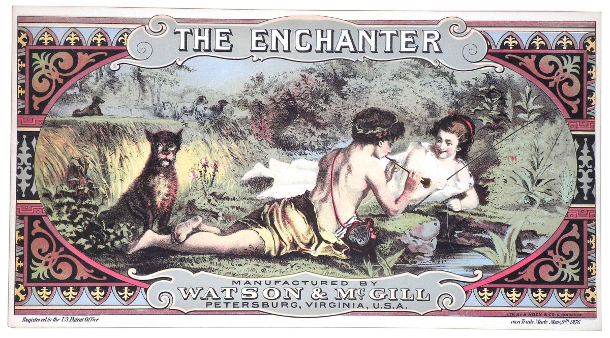 The Enchanter Tobacco Label. Mfg. by Watson & Mc Gill Petersburg, VA. Excellent condition, framed under glass. 13 X 7 inches image only. Start Price $20