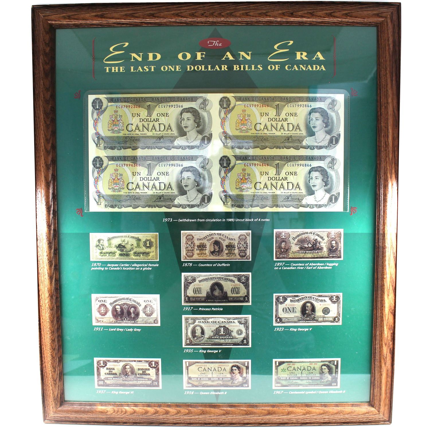 *The End of an Era - The Last One Dollar Bills of Canada Set in Wooden Frame Featuring an Uncut Block of 4x 1973 $1 Banknotes with ECV Prefix and Pictures of the $1 Notes Throughout Canadian History.