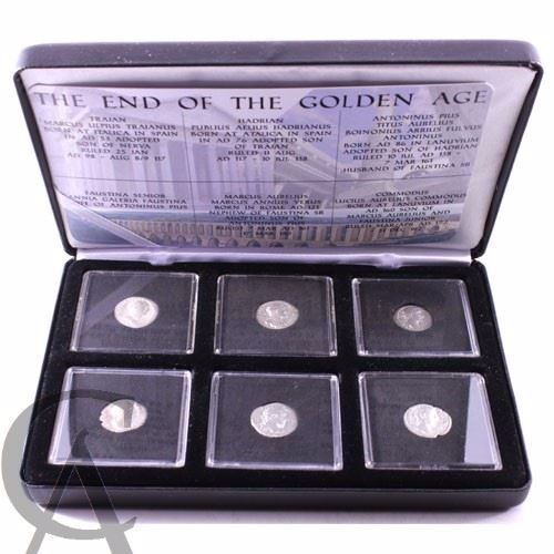 The End of the Golden Age silver 6-coin Roman deluxe set. This set includes Emperor Trajan, Hadrian, Antonius Pius, Faustina (wife of Emperor Trajan), Marcus Aurelius and Commodus.