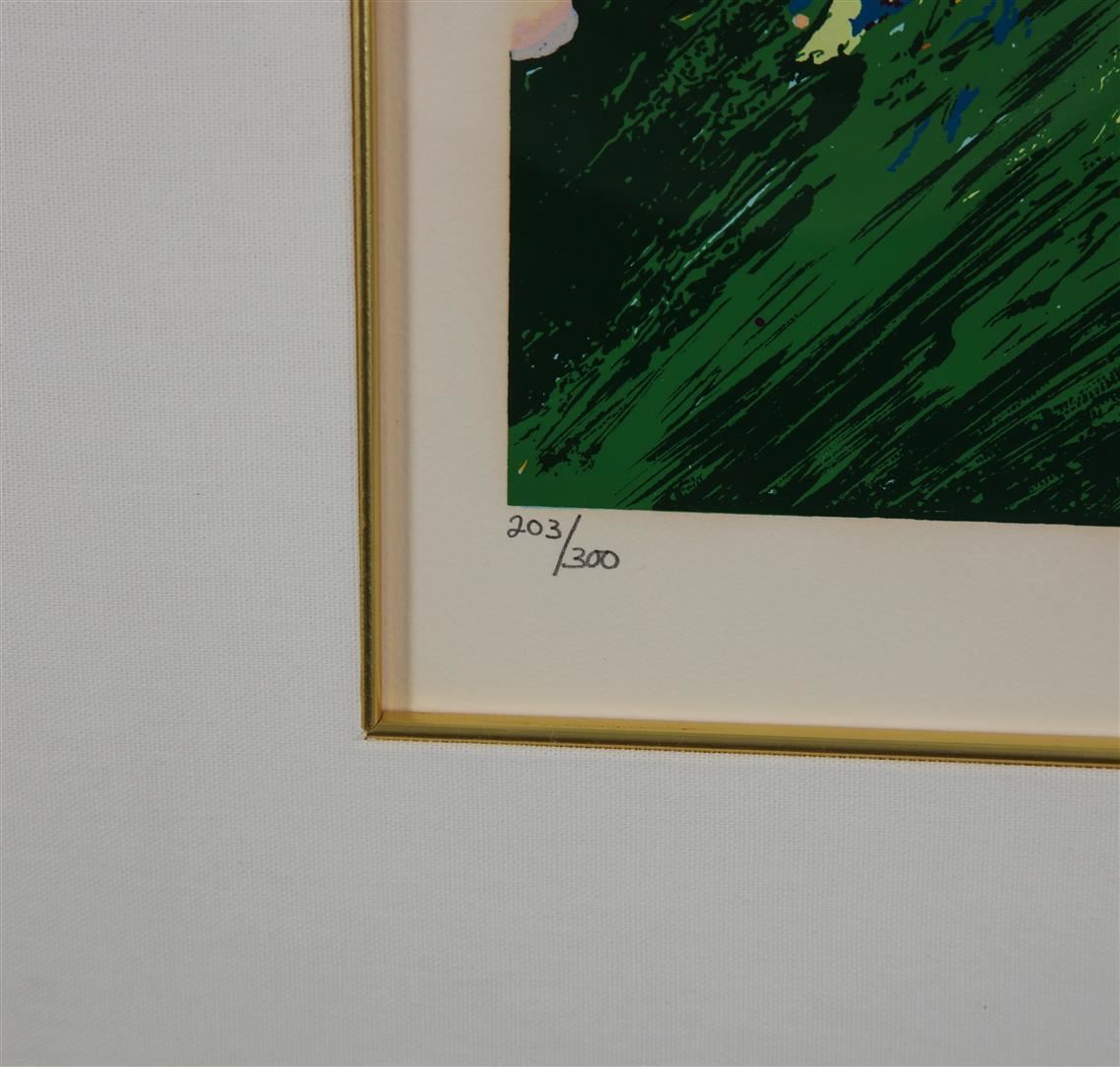 This limited edition #203 of 300 serigraph is pencil signed by world famous artist LeRoy Neiman. LeRoy Neiman was an American artist known for his brilliantly colored, expressionist paintings and screen prints of athletes, musicians, and sporting events. 27" x 40" framed.