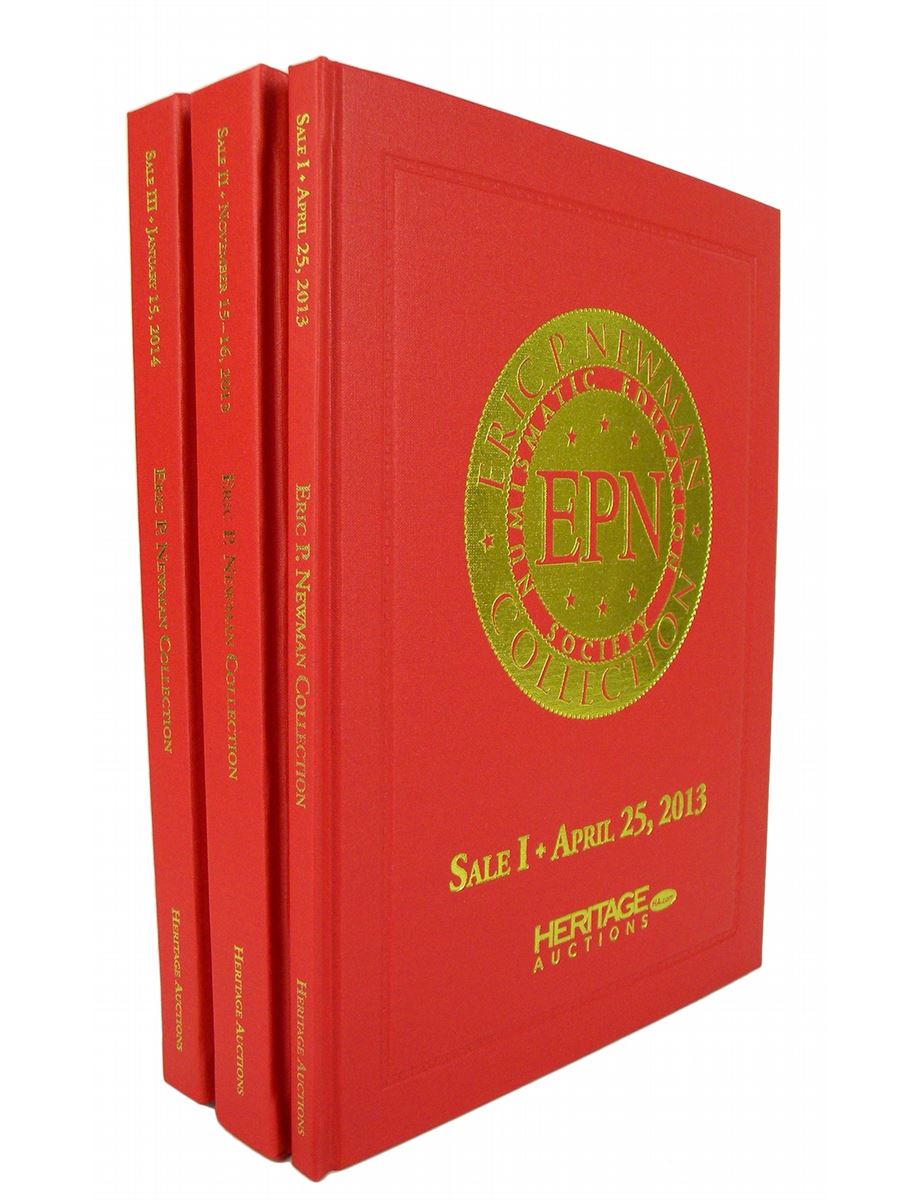 Heritage Auctions. SELECTIONS FROM THE ERIC P. NEWMAN COLLECTION PARTS I-III. Three volumes. April 25, 2013; November 15-16, 2013; and January 15, 2014. All 4to, original matching cardinal red cloth, gilt, bordered in blind. 126 + 484, (49) + 395 pages; 158 + 1910 + 1909 lots; illustrated in color throughout. Prices realized lists bound in. Fine. The Special Hardcover Editions of this important series of sales.