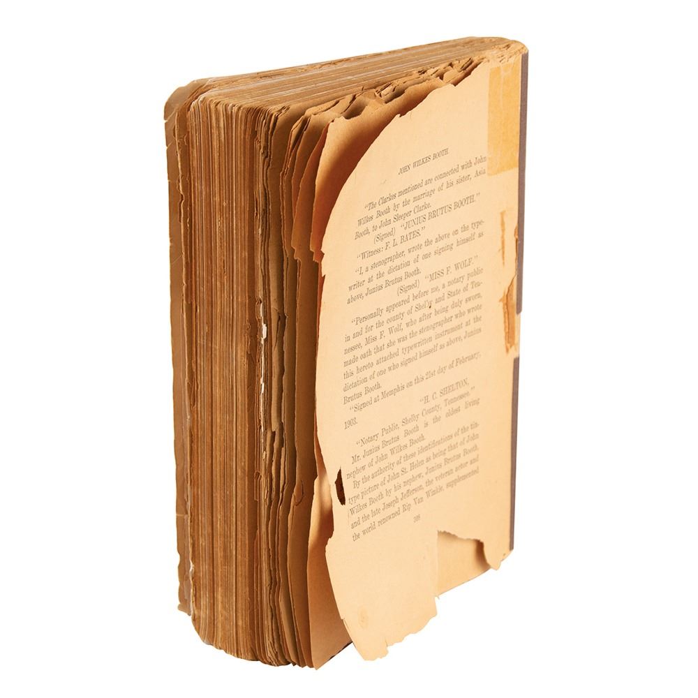 Scarce unsigned book: The Escape and Suicide of John Wilkes Booth by Finis L. Bates. First edition. Memphis, TN: The Historical Publishing Co., 1907. Paperback, 5.25 x 7.5, 308 pages. The title page describes the work as "the first true account of Lincoln's assassination, containing a complete confession by Booth many years after the crime, giving in full detail the plans, plot and intrigue of the conspirators, and the treachery of Andrew Johnson, then Vice-President of the United States." In poor condition, with tape repairs to spine and some interior pages, heavy creasing and tears to front cover, rear wrapper missing, and various tears, chips, and paper loss to edges.