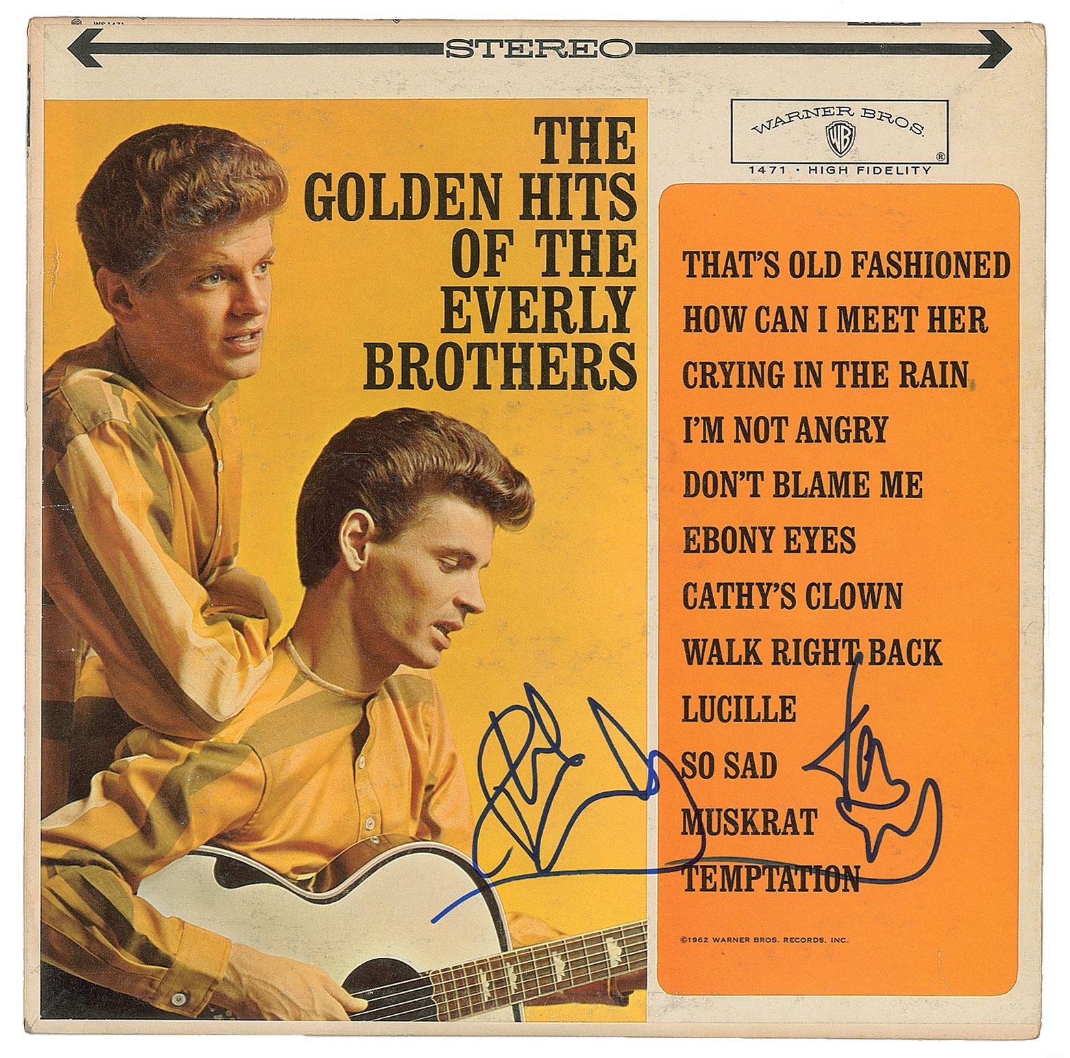 The Golden Hits of The Everly Brothers album signed on the front cover in blue felt tip by Don Everly and Phil Everly. In fine condition. The record is included.