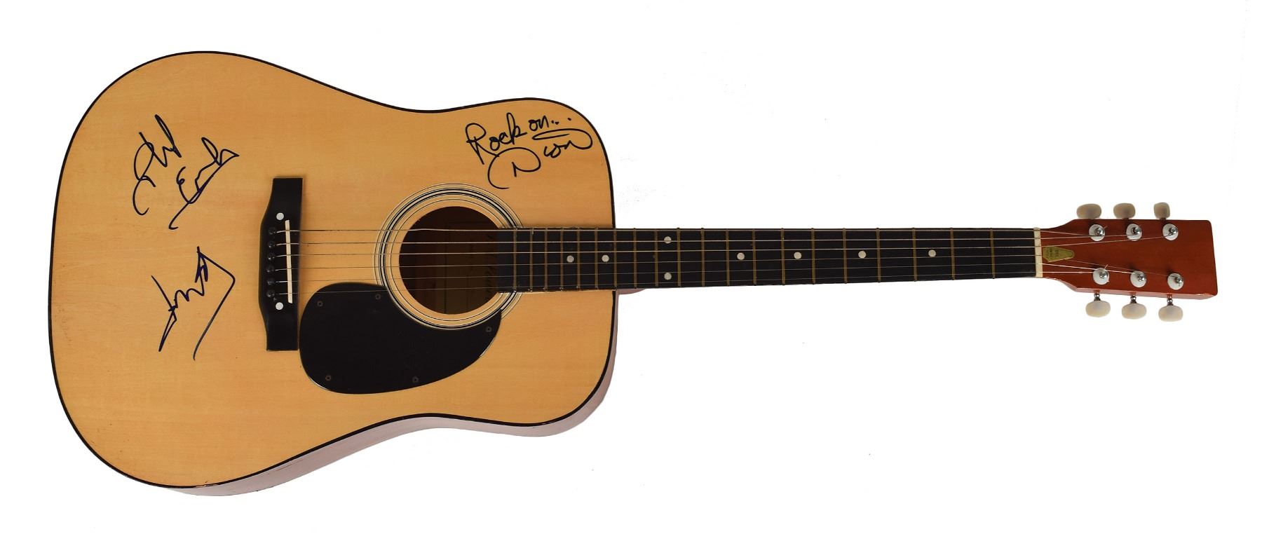 Natural-finish T. A. Lawerance acoustic guitar, signed on the body in blue felt tip by Phil Everly and Don Everly, and by Dion, who adds "Rock on…" In fine condition, with light scuffing and lower slight separation to lower wooden back. Originally obtained by in-person specialist Mike Wehrmann.