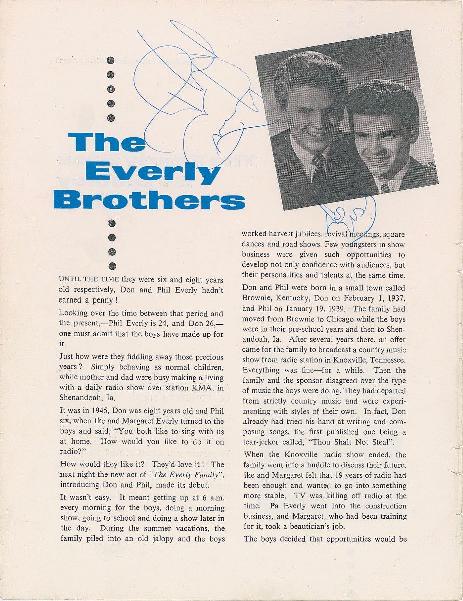 Blue ballpoint signatures, “Phil Everly” and “Don Everly,” on an off-white 8 x 10.5 page removed from a 1964 UK tour program. In fine condition.