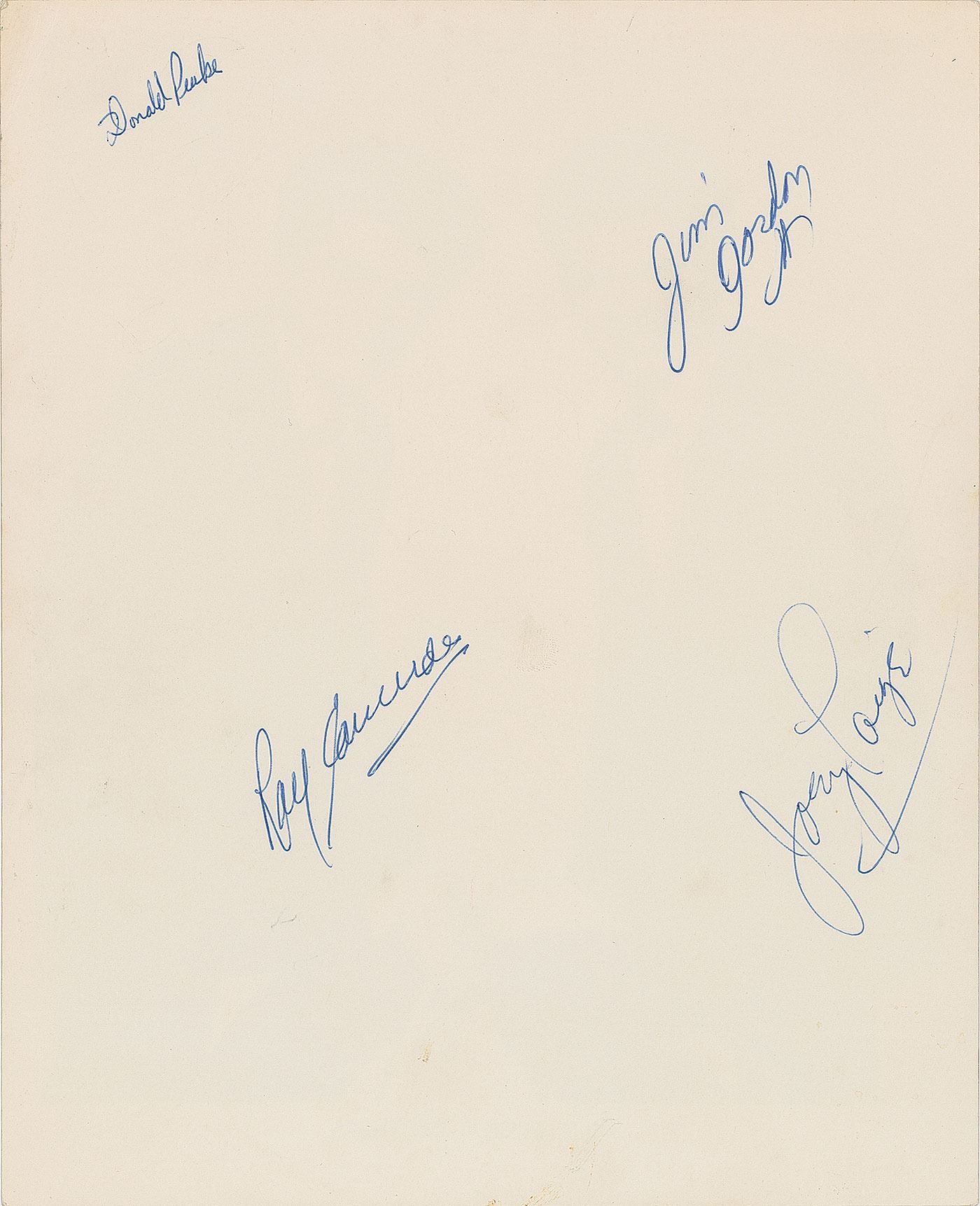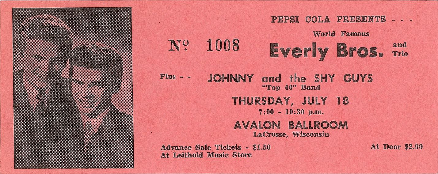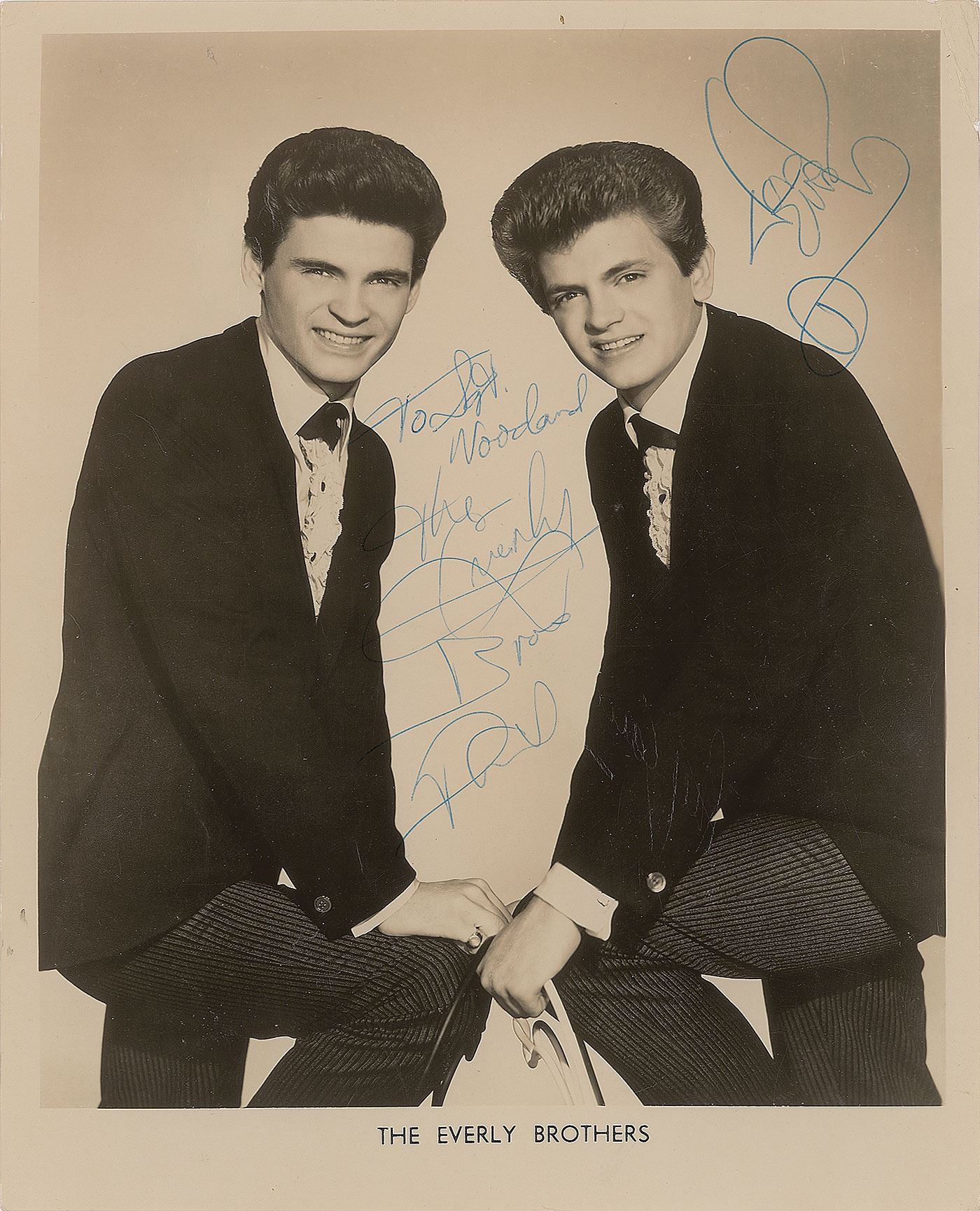 Vintage glossy 8 x 10 publicity photo of The Everly Brothers, signed and inscribed in blue ballpoint, "To Sgt. Woodward, The Everly Bros., Phil" and "Don Everly.” Also signed on the reverse by band members Don Peake, Jim Gordon, Joey Paige, and one other. Includes an original ticket for the Everly Bros. at the Avalon Ballroom in LaCrosse, Wisconsin, on July 18, 1961. In very good to fine condition, with impressions of four band members' signatures on the reverse showing through to the front.