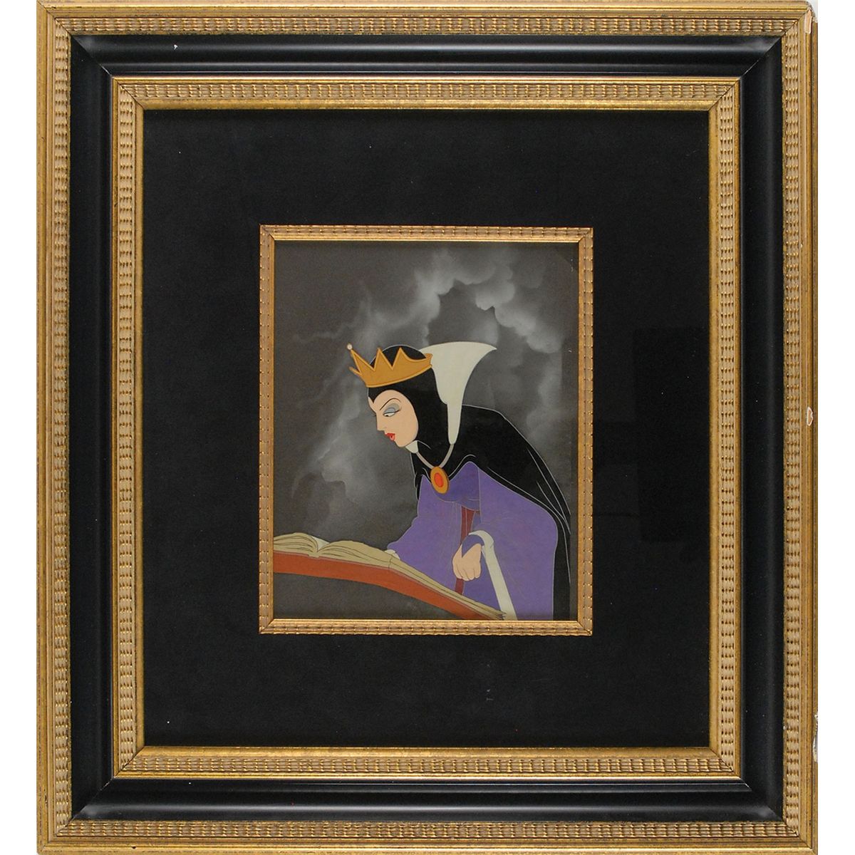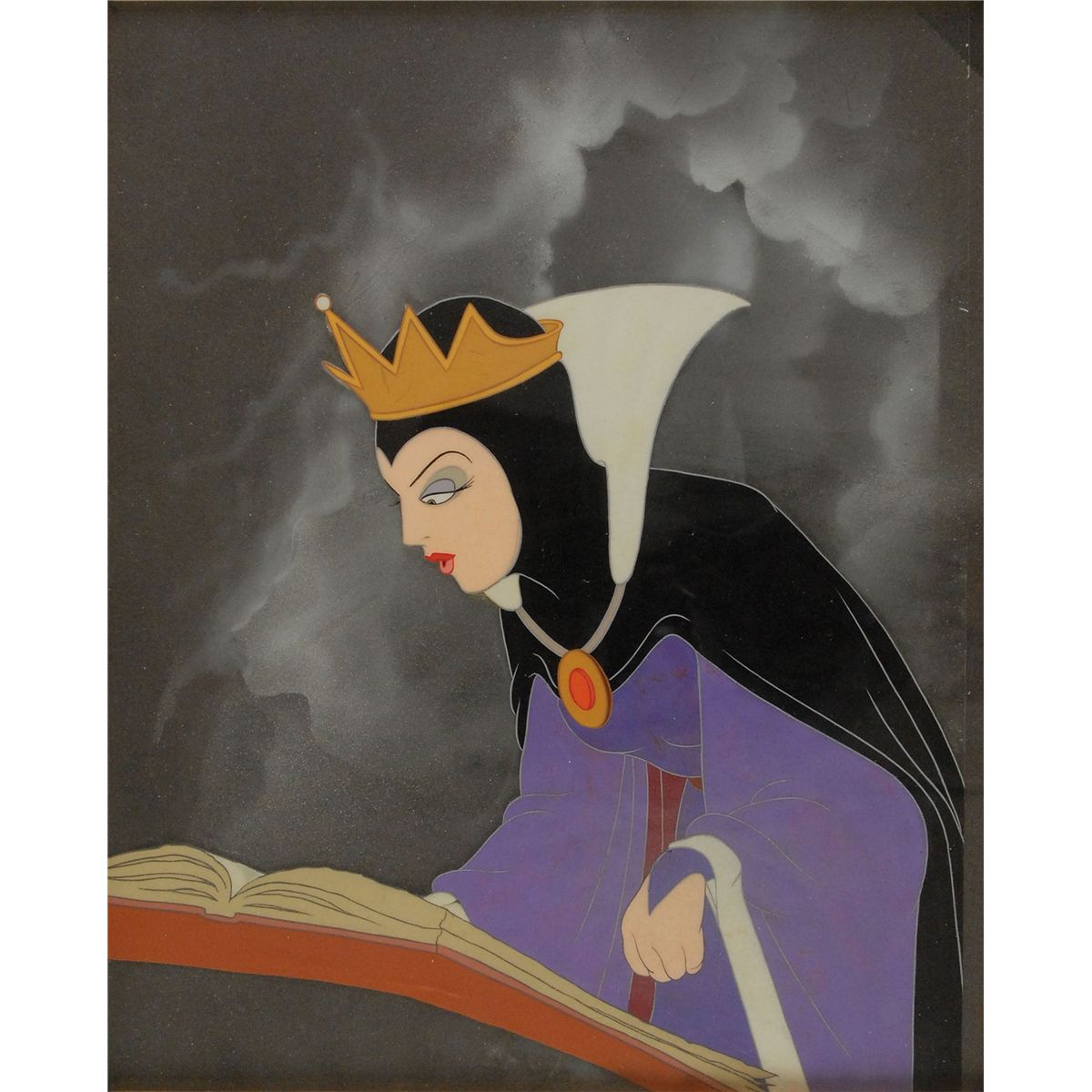(Walt Disney Studios, 1937) Original production cel featuring the Evil Queen from Snow White and the Seven Dwarfs, showing the villain flipping through a book of potions. The cel has been trimmed to image and applied to an airbrushed background as prepared by the Disney Studio to be sold at the Courvoisier Galleries. Image measures 7.5 x 7, with a mat opening of 8 x 9.5. This piece is also framed to an overall size of 20 x 21.5. In fine condition, with a chip to a corner of the frame. This image is from the scene when the Evil Queen is in her potions room and looking through her red ‘disguises’ book in order to change her appearance to that of the old witch to trick Snow White into taking the poison apple—this cel depicts the exact moment that she is deciding which spell to use for the task. A magnificent piece from this historically important animated feature.
