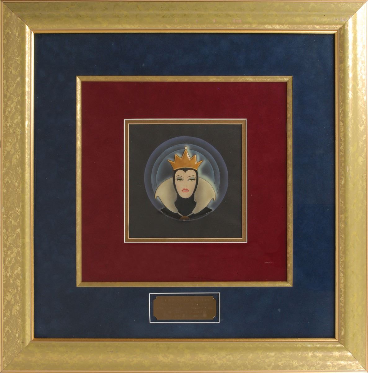 (Walt Disney Studios, 1937) Incredible original production cel from Snow White and the Seven Dwarfs, depicting the reflection of the Evil Queen just moments before she transforms herself into a horrible witch. The cel has been trimmed and applied to a hand-painted background as prepared by Courvoisier Galleries for sale. Image measures 5.25? in diameter, with a mat opening of 7.25 x 7.25. This piece is regally triple-matted and framed with an engraved plaque to an overall size of 23.75 x 24. In fine condition. Obsessed with reclaiming her position as ‘the fairest one of all,’ the Evil Queen drinks a powerful elixir and transforms herself into an old hag, a disguise intended to trick Snow White into tasting a poisoned apple. This remarkable cel portrays the Evil Queen in all her haunting and vainglorious beauty during one of the most dramatic scenes in animation history. Given that the Queen is present in only a handful of scenes, this cel remains exceedingly scarce, and is thus highly sought-after by collectors.