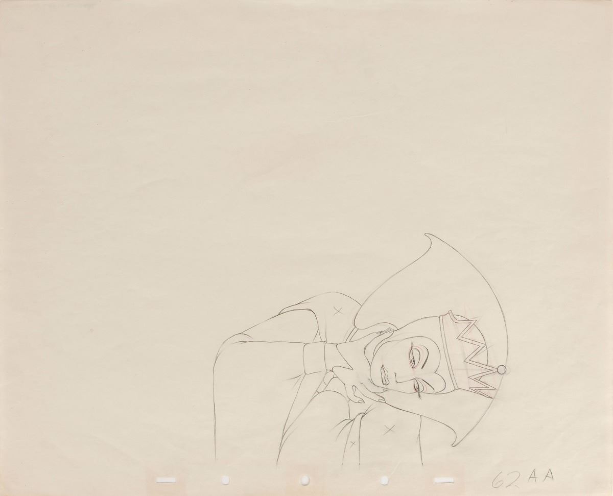 (Walt Disney Studios, 1937) Original production drawing featuring the Evil Queen from Snow White and the Seven Dwarfs, showing the notorious villain during her transformation into the witch. Accomplished in graphite on untrimmed 15.5 x 12.5 animation paper. Image measures 7.5 x 6. In fine condition.