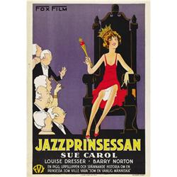 <B>The Exalted Flapper (Fox, 1929).</B></I> Swedish One Sheet (27.5" X 39.5"). In this romantic fantasy, a flapper princess refuses to marry her intended, a prince she has never met. Later she meets a young man, who turns out to be the prince in disguise, and falls in love. Irene Rich, Barry Norton, and Sylvia Field star. There is wrinkling in lower left corner, minor edge wear and small tears. Rolled, Very Fine. ****<BR><BR><b>Shipping:</b> Rolled Material (<a target="_blank" href="http://www.heritageauctions.com/common/shipping.php">view shipping information</a>)