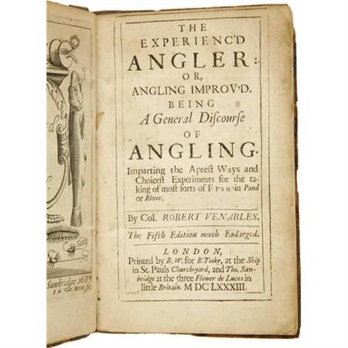 <B>Col. Robert Venables: An Interesting Discourse on Fishing: <I>The Experience'd Angler or, Angling Improv'd. Being A General Discourse of Angling.</B></I></B></I><I> Imparting the Aptest Ways and Choicest Experiments for the taking of most sorts of Fish in Pond or River. By Col. Robert Venables. The Fifth Edition much Enlarged.</B></I> (London: Printed by B.W. for B. Tooke, at the Ship in St. Pauls Church-yard, and Tho. Sawbridge at the three Flower de Luces in little Britain, 1683). Fifth edition. Small octavo (5 ¾” x 3 5/8”). Seventeenth-century leather boards rebacked to style, and with a new leather spine lettering label. xiv , 96, 6, table pp. Engraved frontispiece and several engravings of fish in the text. Boards are a bit worn, but appropriately so for their age and still attractive. Front free endpaper has a tear at the bottom. Minor browning and foxing, mostly around the sheet edges. Small ink stain to fore-edge. A very good, handsome copy, housed in a custom cloth chemise and quarter morocco book-backed slipcase.<BR><BR><b>Shipping:</b> Books & Catalogs (<a target="_blank" href="http://www.heritageauctions.com/common/shipping.php">view shipping information</a>)