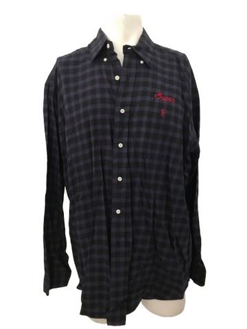 The Extreme Adventures of Super Dave (2000) - Super Dave's (Bob Einstein) screen worn custom engraved Ralph Lauren purple and black plaid long sleeve button down flannel shirt (XL) with a Pure Stuff navy t shirt (L). Includes costume department wardrobe tag.