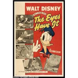 The Eyes Have It (RKO, 1945). One Sheet (27" X 41"). By 1945 Donald Duck had become the star of many Disney shorts. In fact, in 1945 more duck shorts were made than for any other character. In this outing, Donald receives a mail-order hypnosis kit complete with hypnotic goggles which he decides to test on Pluto. This one sheet is in exceptionally clean and unbacked shape. It has linen hinge tape on the backside of the poster at three points in the upper border for framing purposes. Colors are sharp. Very Fine+. Important notice: Heritage usually auctions material at the rate of 200-250 lots per hour. On some occasions eBay Live bid software or the Internet may not be able to keep up with the pace of the auction. We recommend placing a realistic absentee bid now as insurance to avoid disappointment. Occasionally the auctioneer may eliminate or reject an eBay Live bid, and the auctioneer may also reopen a lot after the close of the eBay live bidding (usually because we missed an audience bid), and may reject your bid even if it shows you as the winning bidder. By bidding via eBay Live, you agree that Heritage may award the lot to another bidder at its sole discretion under the circumstances described above or any other reasonable circumstances. Also please note that all Heritage lots purchased through eBay Live carry a 20% Buyer's Premium. Please make sure you read the Terms and Conditions before you bid.