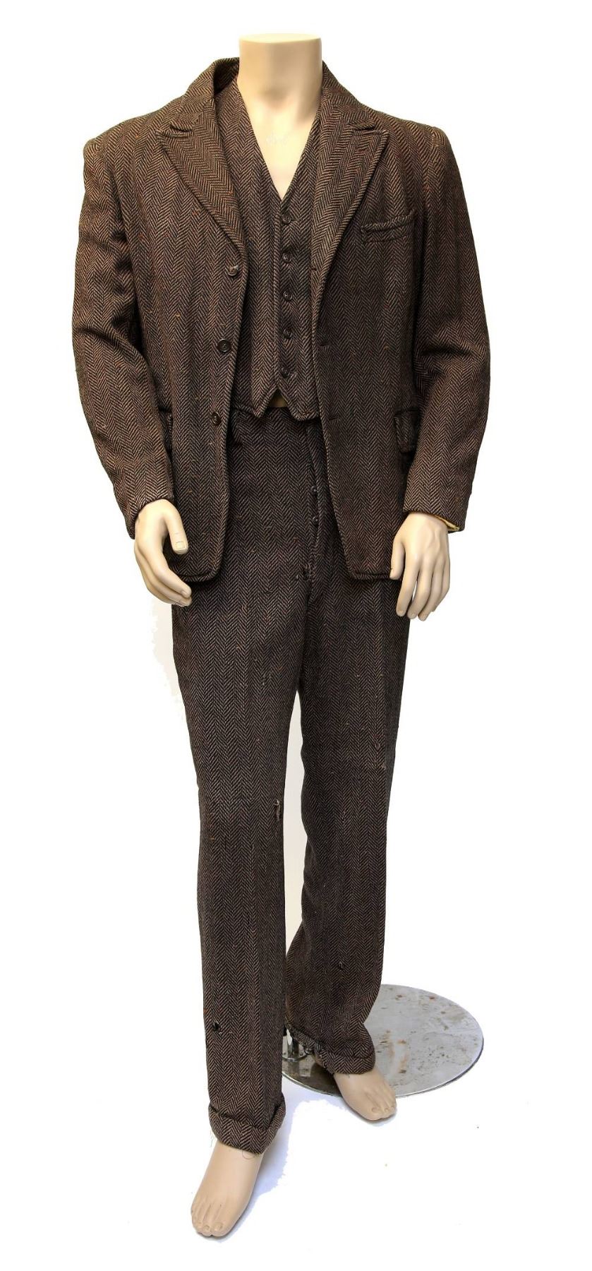 The Fabulous Dorseys (1947) - Tommy Dorsey production made three-piece suit comprising a brown and black tweed jacket and matching waistcoat and trousers. The jacket with Western Costume Co barcode (40153345) and ink inscriptions to inside. The waistcoat and trousers with Western Costume Co label, barcodes (40153939) and 40121566 respectively) and ink inscriptions within.