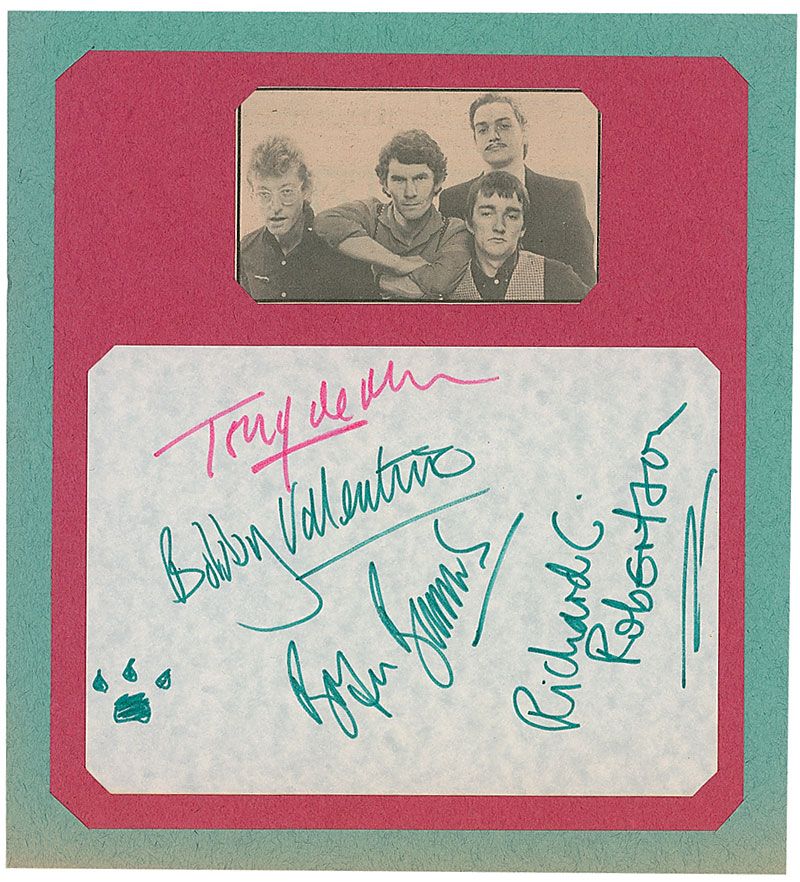 In-person felt tip signatures of Bobby Valentino, Tony de Meur, Richard Robertson, and Bryn Burrows on an off-white 6 x 4.25 album page, with one adding a small sketch of a poodle paw print. In fine condition.