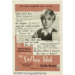 <B>The Fallen Idol (British Lion, 1948)</B></I> Double Crown (20" X 30"). Told almost entirely from a child's point of view, Carol Reed's chilling film about a boy's idolization of the family butler and the later complications make for a classic post-war film. This script was adapted from the Graham Green story "The Basement Room," and stars Bobby Henrey and Ralph Richardson. This original Double Crown is country of origin and pictures the young star amongst headlines of his success in the film. There is the most minor fold line and centerpoint touchup. Very Fine+ on Linen.