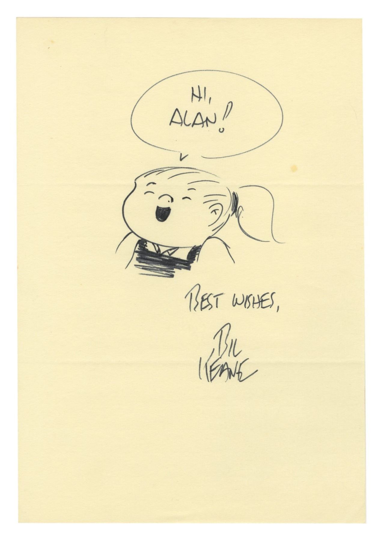 (Keane, c.1980) An original drawing of Dolly from the comic strip series "The Family Circus" illustrated and signed by the creator of the series, Bil Keane. Accomplished in ink, the drawing has an image size of 4.5"x3.5" on 10.5"x7.25" thin paper. The condition is very good with a couple small spots of discoloration and faint tri-fold lines from when the drawing was originally mailed.